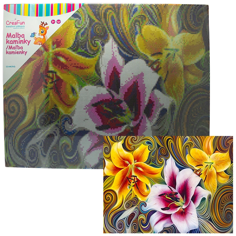 Diamantmalerei – Blumen 40 × 50 cm verbindet Kreativität mit Präzision. Platzieren Sie einfach gemäß der Vorlage die farbigen Steinchen auf die selbstklebende Leinwand und beobachten Sie, wie vor Ihren Augen ein wunderschönes Blumenmotiv entsteht. Der Prozess ist beruhigend, macht Spaß und bringt Freude am fertigen Werk.