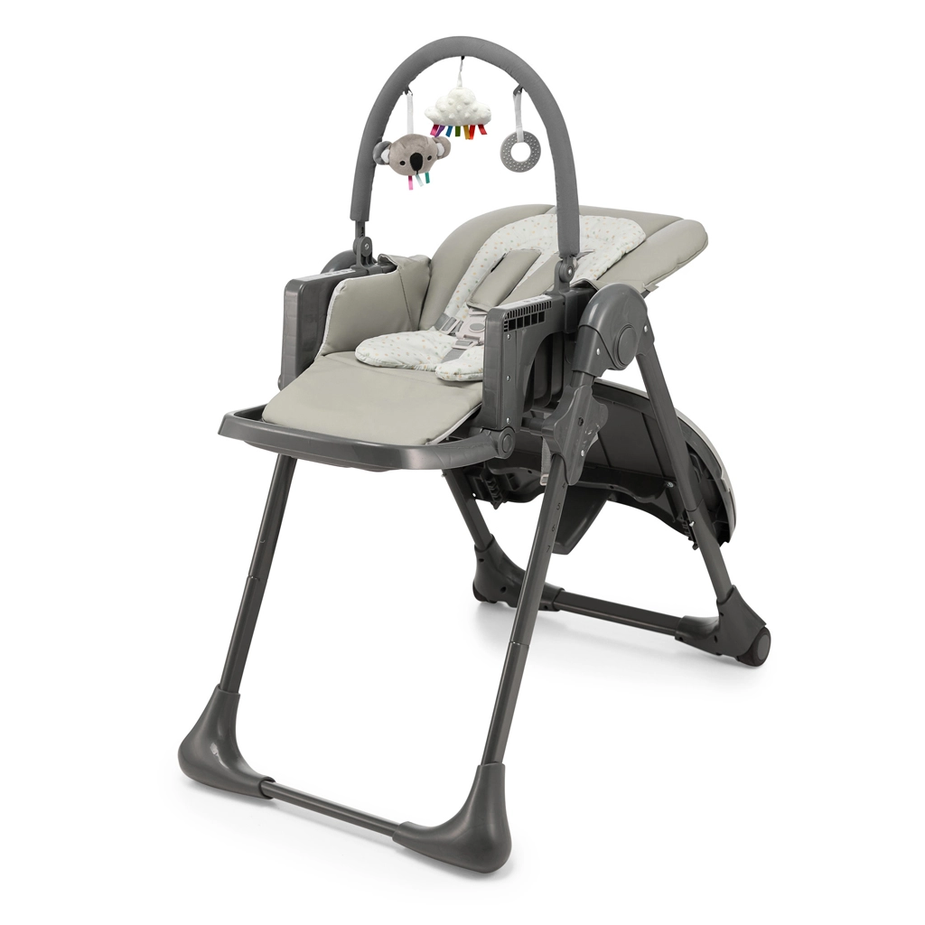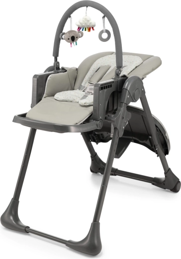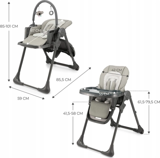Kinderkraft Tummie ist ein praktischer Hochstuhl und ein bequemer Liegesitz in einem. Dank der umfangreichen Verstellmöglichkeiten erleichtert er Eltern das Füttern ab etwa 4 Monaten und den täglichen Ruhemodus des Babys ab der Geburt. Das Doppeltablett mit abnehmbarer oberer Schale vereinfacht die Pflege, der Sitz mit weicher Einlage und Kopfstütze sorgt für Ergonomie und Komfort, während der 5-Punkt-Gurt und der stabile Rahmen die Sicherheit gewährleisten.