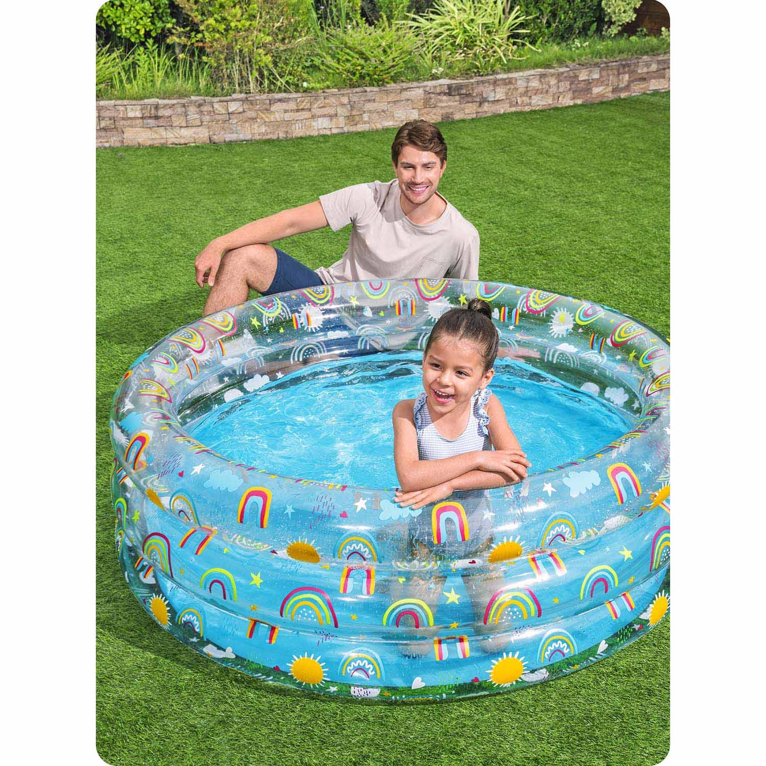 Der aufblasbare Bestway-Pool mit verspielten Regenbogenmotiven ist eine hervorragende Wahl für den Outdoor-Wasserspaß von Kindern ab 6 Jahren. Robustes PVC-Material und drei separate aufblasbare Ringe sorgen beim Toben für Stabilität und Komfort. Mit einer für Kinder angenehmen Tiefe bietet er sichere und unterhaltsame Erfrischung im Garten.