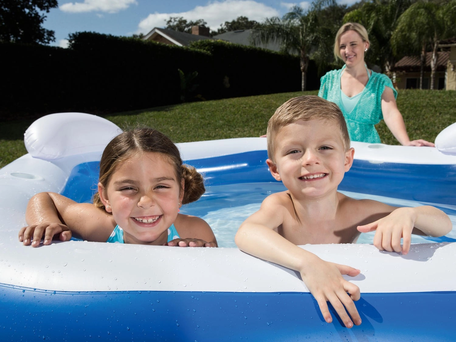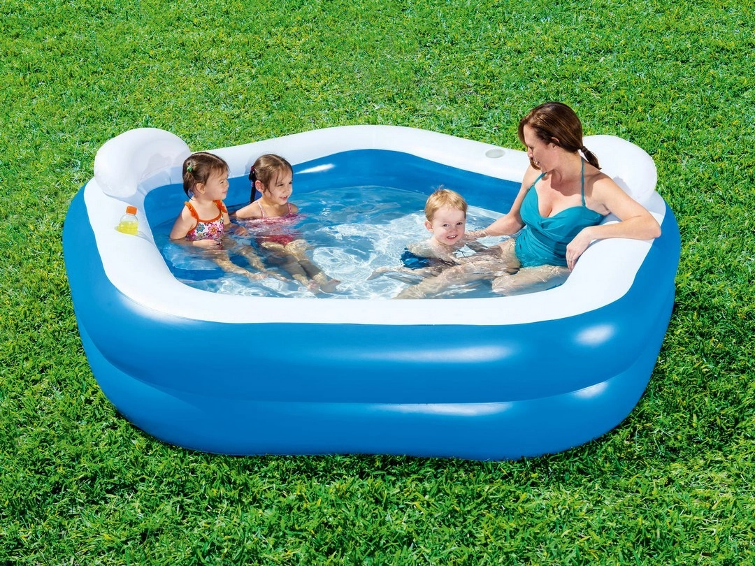 Genießen Sie sommerliche Erfrischung mit dem geräumigen Familienpool BESTWAY in den Maßen 213 × 206 × 69 cm. Er bietet bequemen Einstieg dank weicher integrierter Sitze, zwei Kopfstützen und stabiler Zwei-Kammer-Konstruktion. Praktische Getränkehalter halten Ihre Erfrischung stets griffbereit, während robuste Vinylwände für Langlebigkeit und angenehmes Anlehnen sorgen.