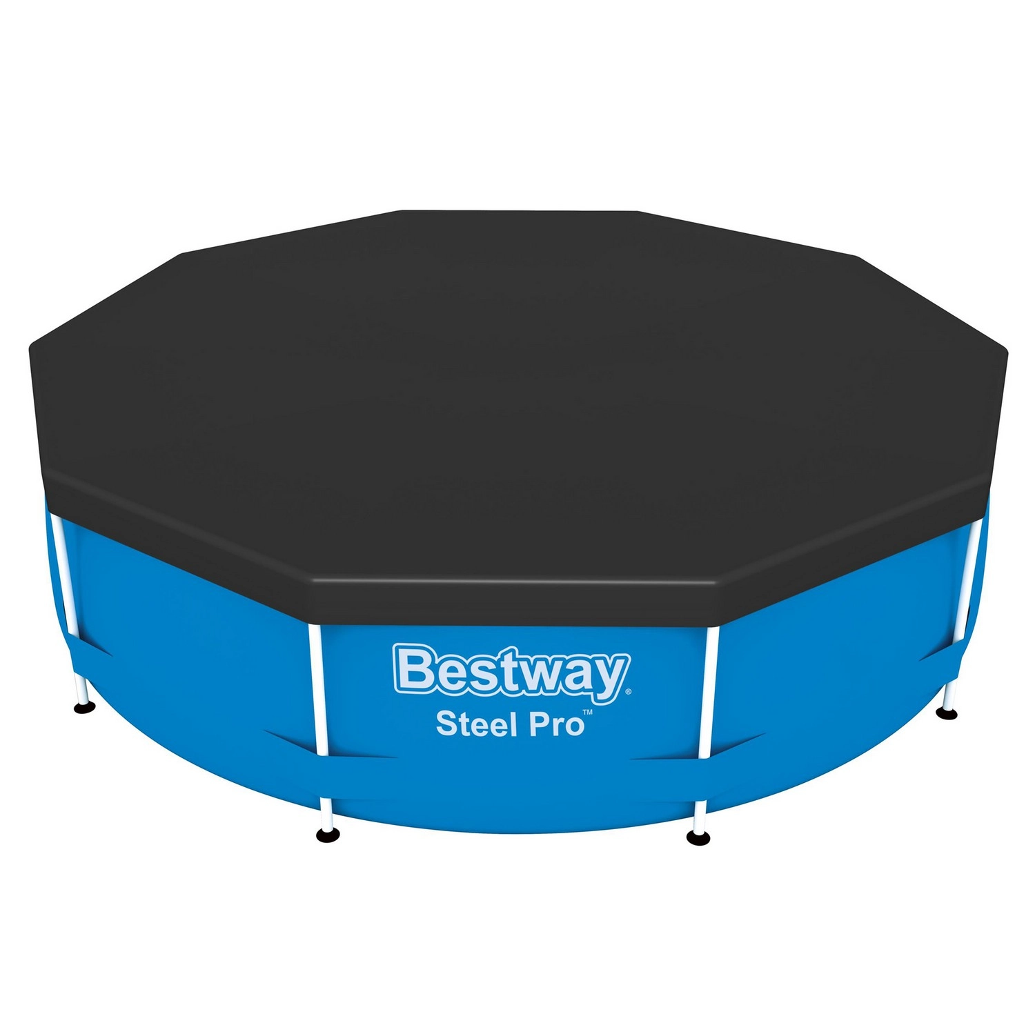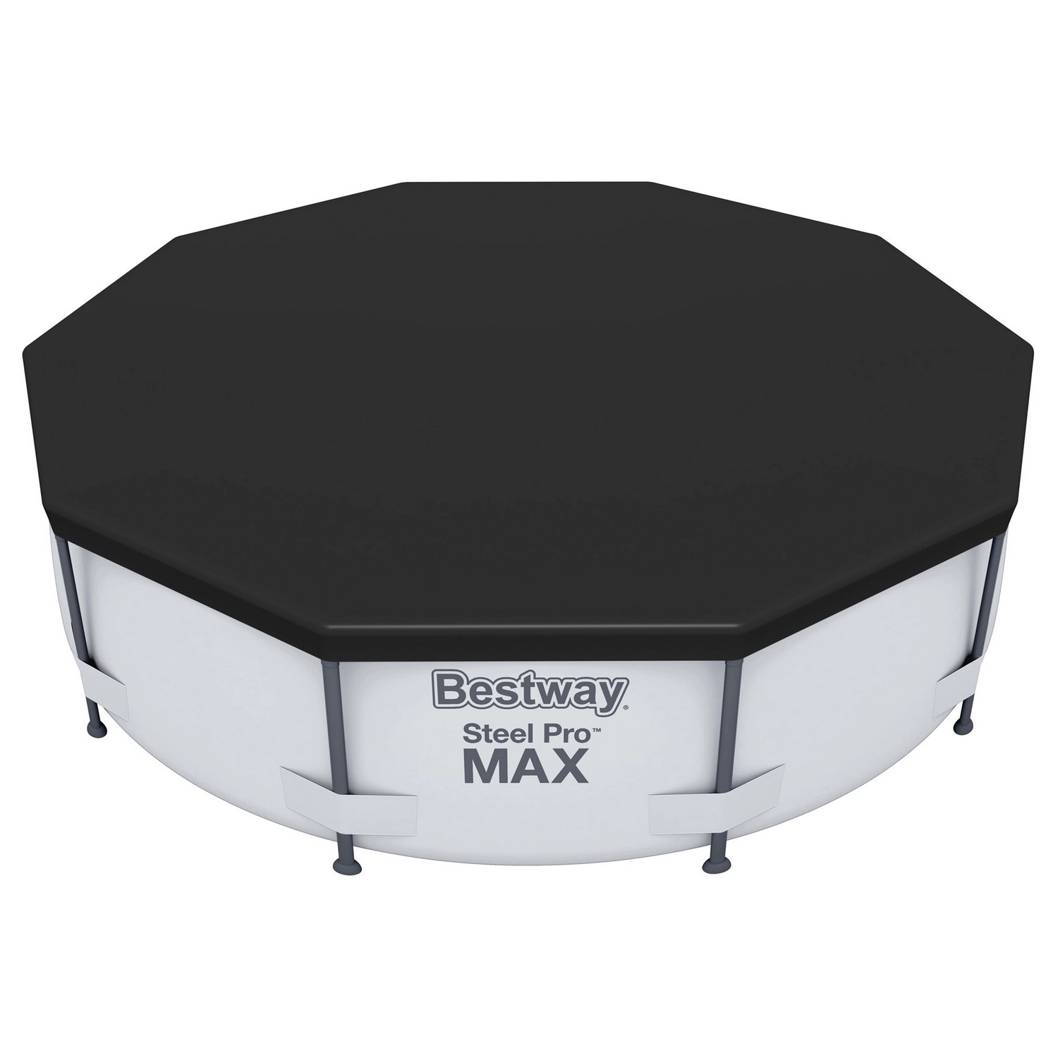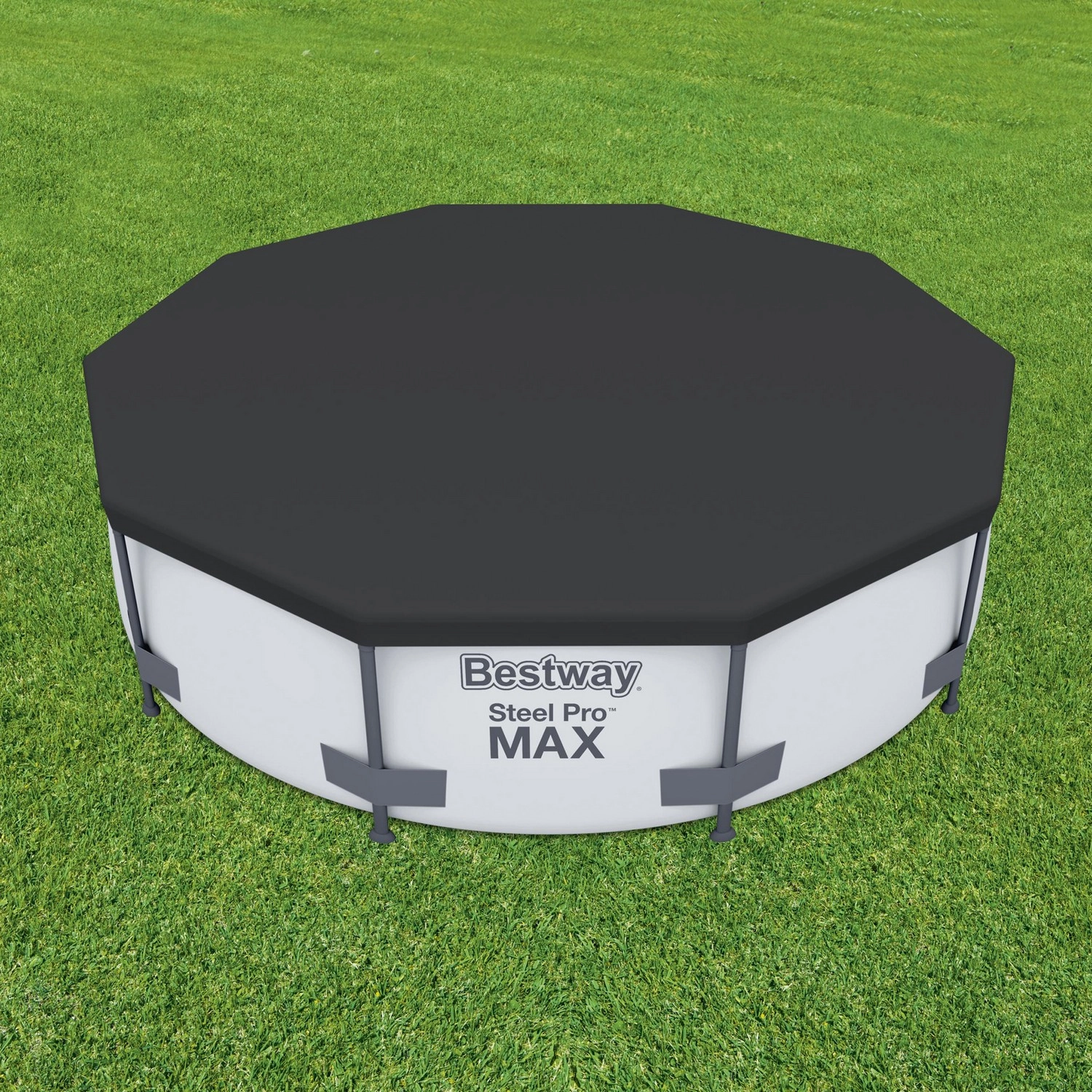 Die Plane ist für Frame-Pools mit einem Durchmesser von 305 cm konzipiert und mit Abflussöffnungen ausgestattet, die eine Ansammlung von Regenwasser auf der Oberfläche verhindern. Mit den Befestigungsschnüren lässt sie sich einfach und fest am Poolrahmen fixieren.