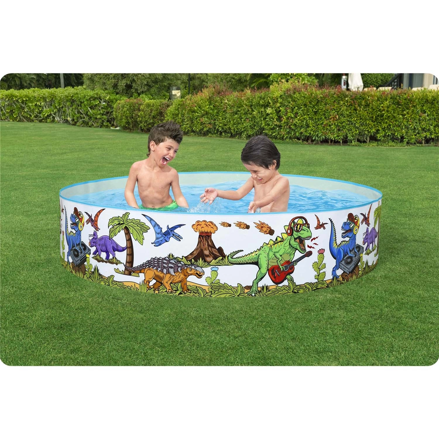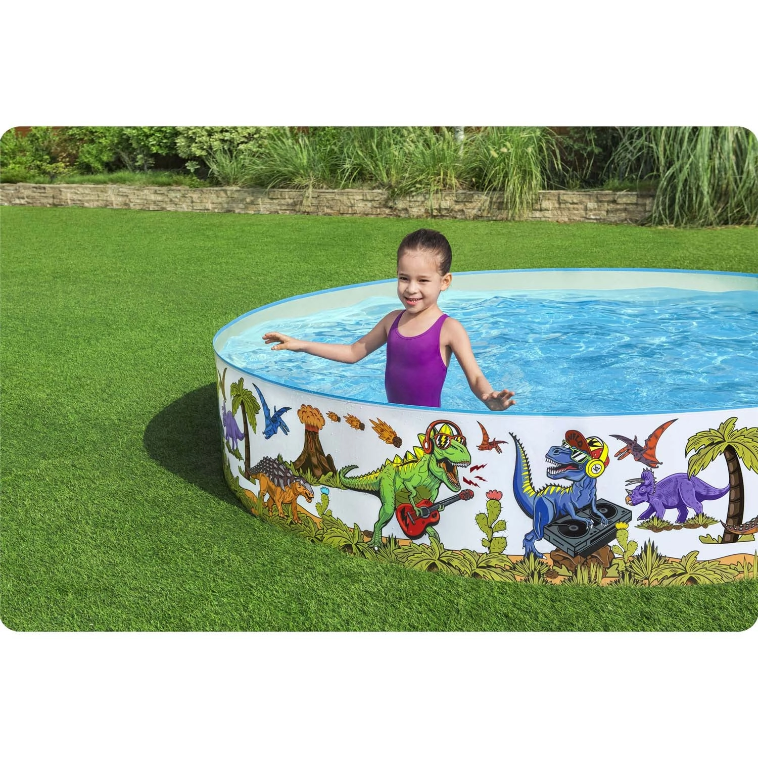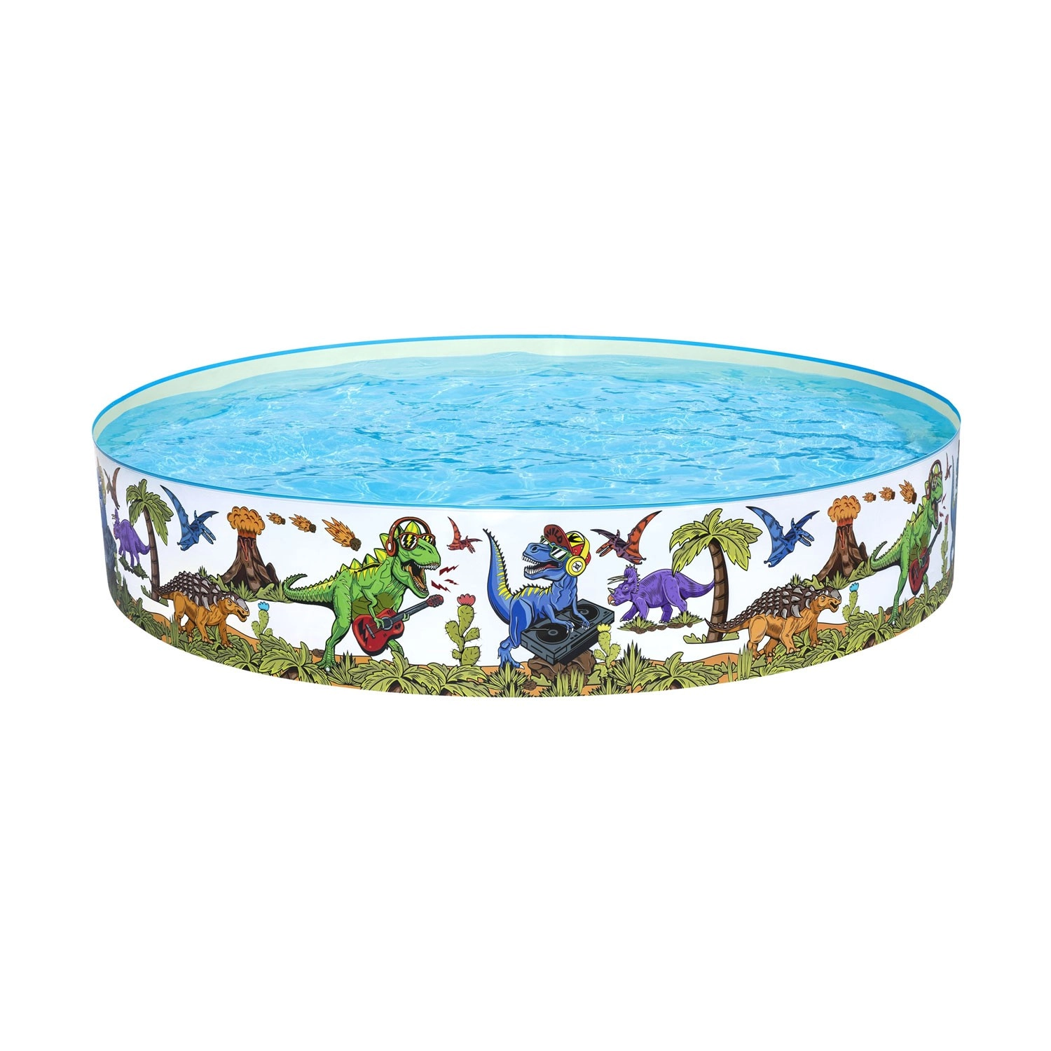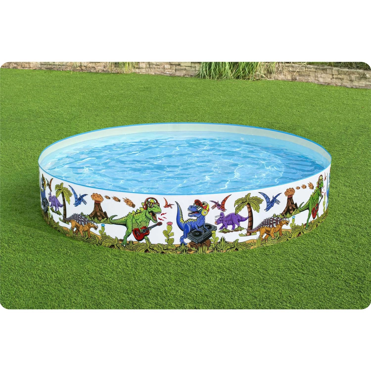 Bunte Dinosaurier-Illustrationen rund um den gesamten Umfang verwandeln Ihren Garten in eine Spaßzone und motivieren Kinder zu Bewegung und Wasserspielen.