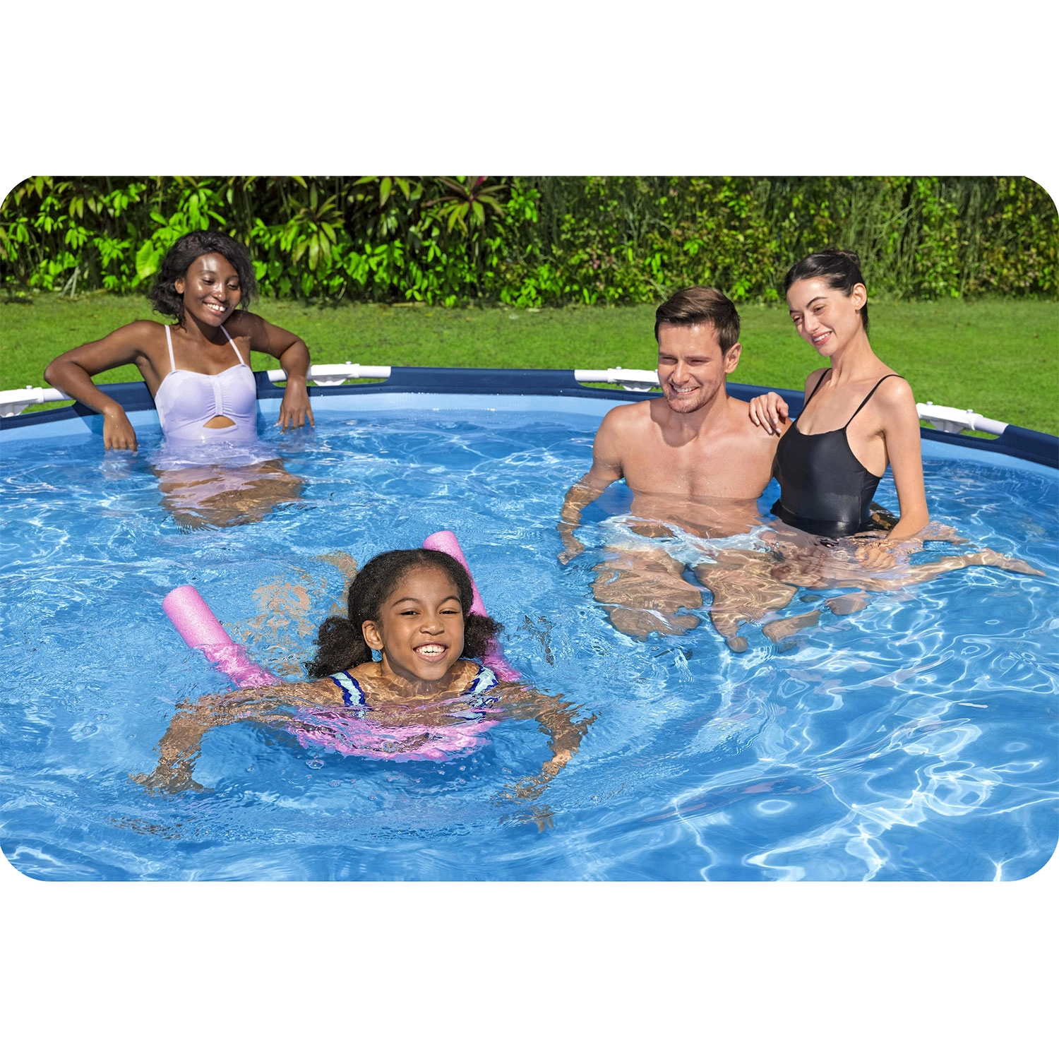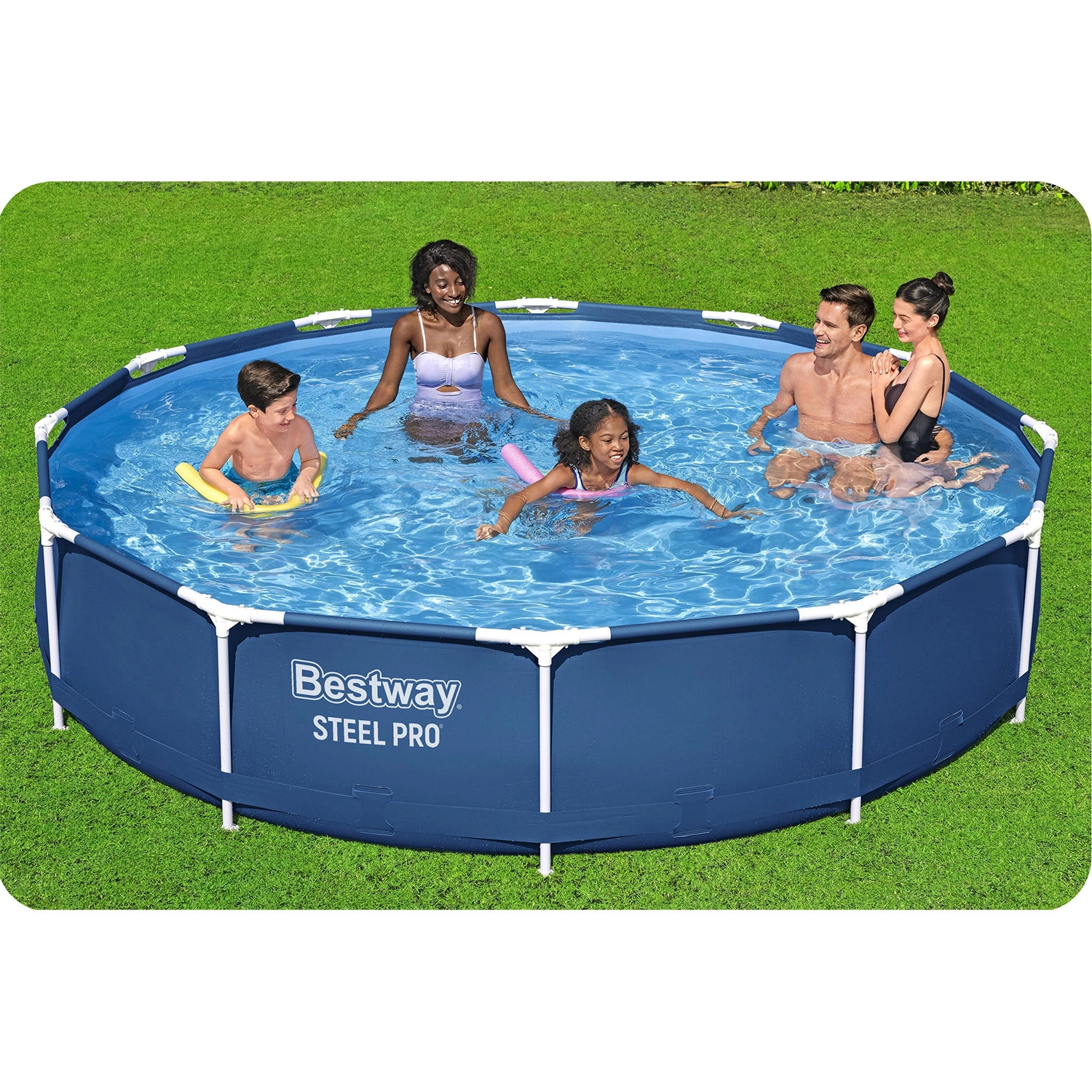 Die stabile Steel Pro Rohrkonstruktion und die 3‑schichtige PVC/Mesh-Folie gewährleisten lange Lebensdauer und sicheres Baden im Garten.