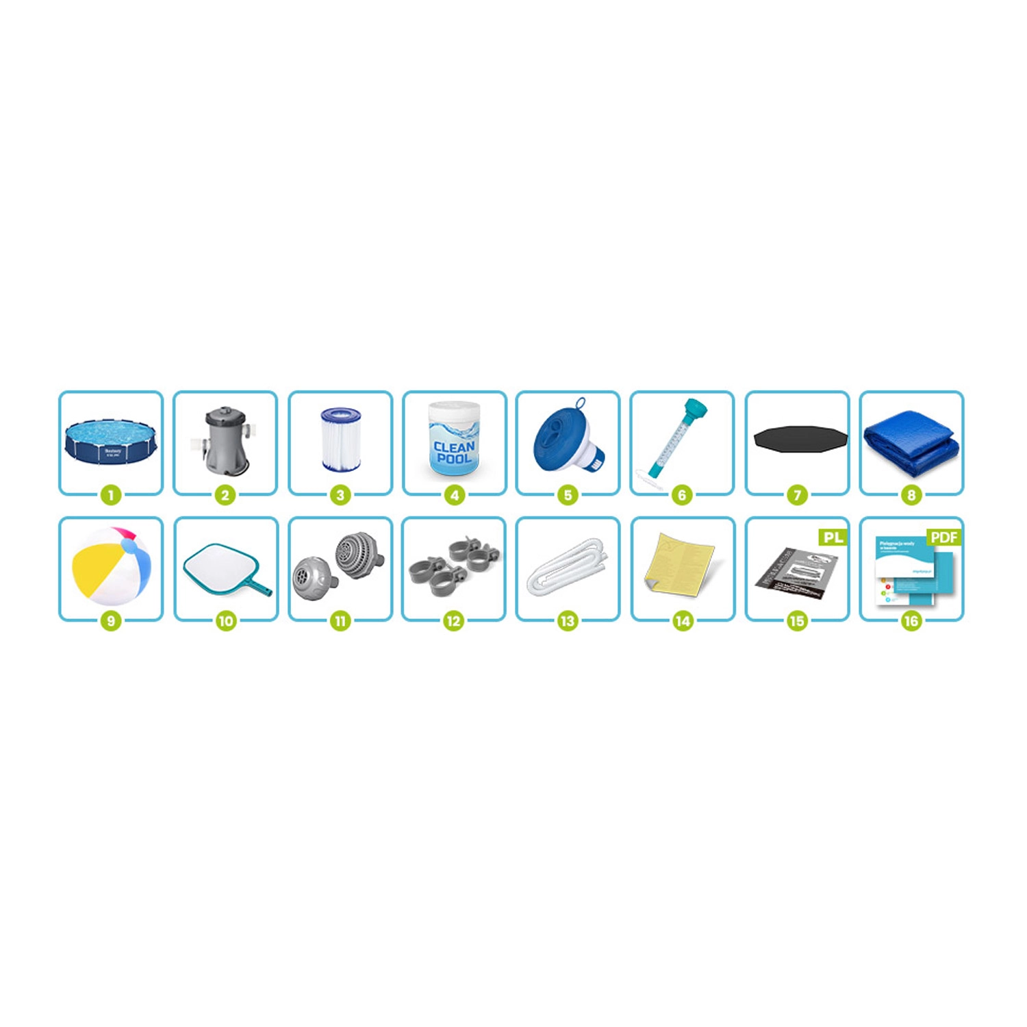 Im Lieferumfang ist alles für eine unkomplizierte Pflege enthalten: Filterpumpe mit Kartuschenfilter, Dosierschwimmer mit Multitabletten zur Desinfektion, Kescher, Abdeckung gegen Schmutz, Unterlage zum Schutz des Bodens sowie ein Thermometer. So erhalten Sie sauberes und sicheres Wasser den ganzen Sommer über bei minimalem Aufwand.