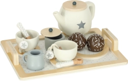 Alles auf einem Tablett: Kännchen, Tassen, Untertassen, Milchkännchen, Zuckerdose, Löffel und ein süßes Extra. Kinder können realistisch servieren und soziale Fähigkeiten trainieren.