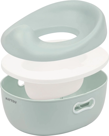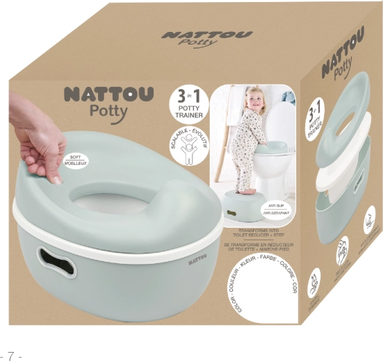Das NATTOU Potty 3-in-1 ist eine smarte Lösung für jede Phase des Toilettentrainings. Es beginnt als kompaktes Töpfchen mit bequemem Sitz und erhöhter Front gegen Spritzer. Sobald das Kind bereit ist, verwenden Sie einfach den Aufsatz für die Standardtoilette und dazu den Tritthocker, der die nötige Höhe und Sicherheit bietet.