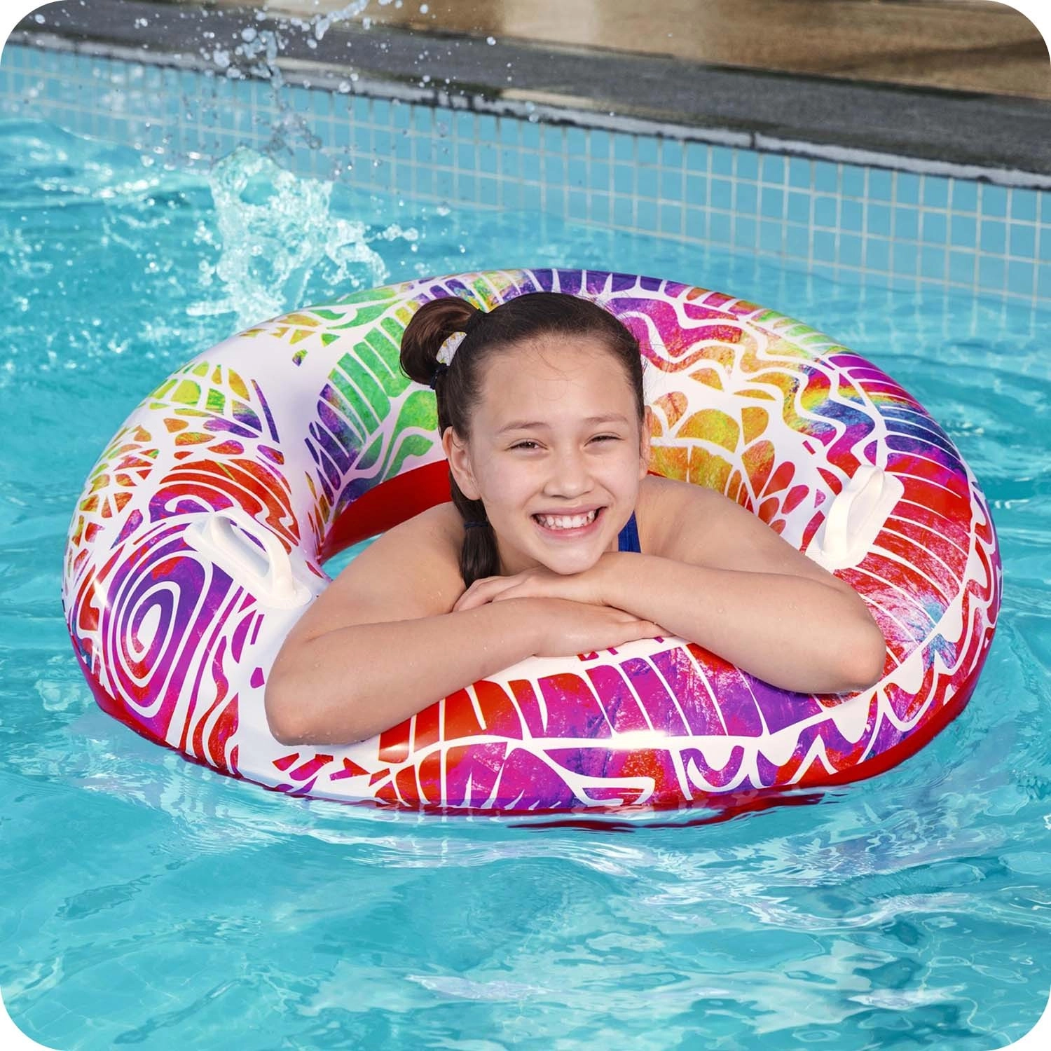Dieser stylische Schwimmring aus robustem PVC trotzt Sonne und Salzwasser und ist damit die perfekte Wahl für Pool und Strand. Der große Durchmesser von 91 cm bietet bequeme Unterstützung und besseren Auftrieb für Kinder ab 10 Jahren.