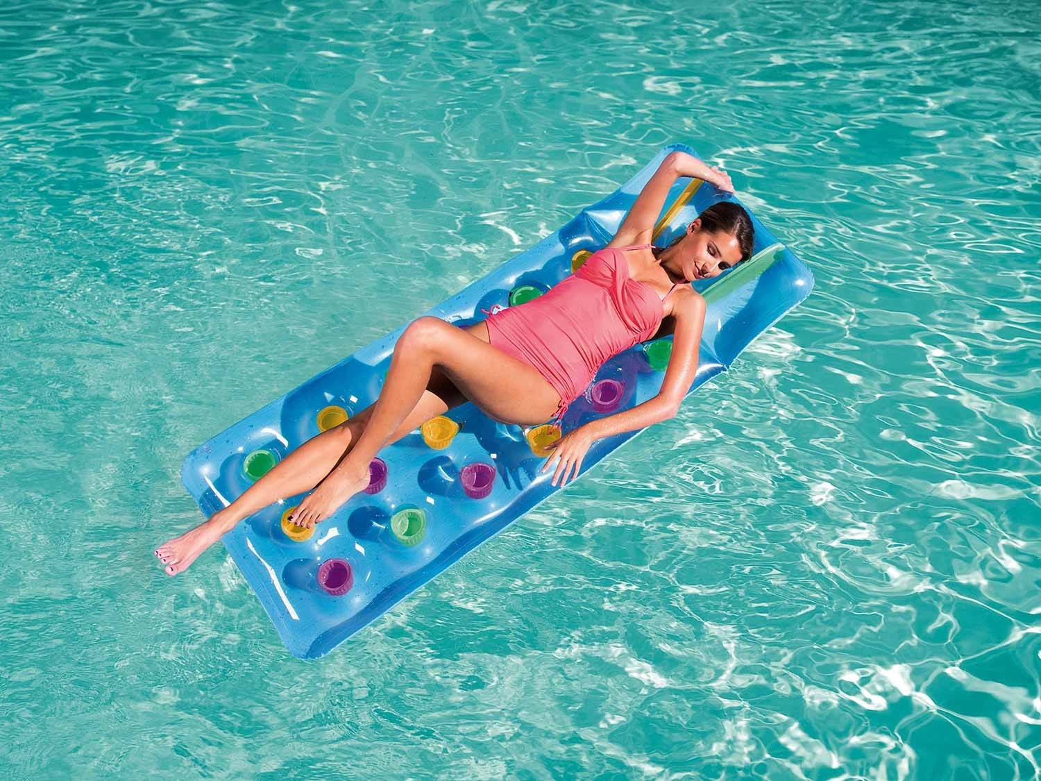 Die Liege aus strapazierfähigem PVC trägt bis zu 90 kg und bietet dank der zwei separaten Luftkammern bessere Stabilität und Sicherheit. Kräftige Farben und ein attraktives Design passen perfekt zur Sommerstimmung.