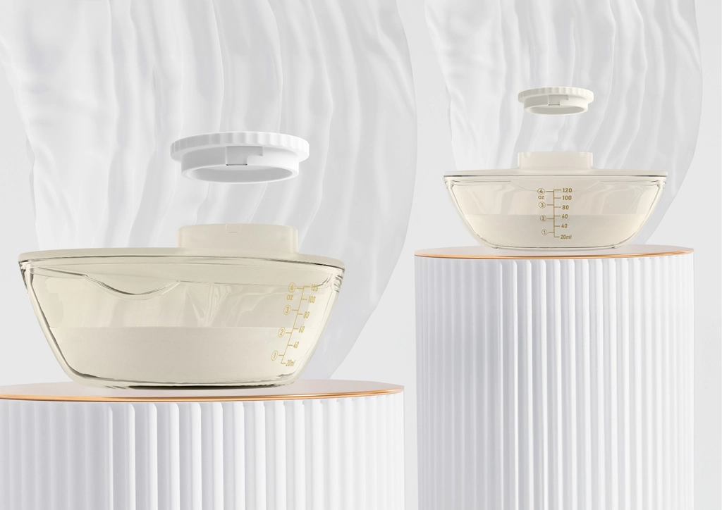 Das Brustschild mit 105°-Winkel umschließt die Brust natürlich für einen besseren Milchfluss. Eine übersichtliche Skala am Behälter erleichtert die Volumenüberwachung.