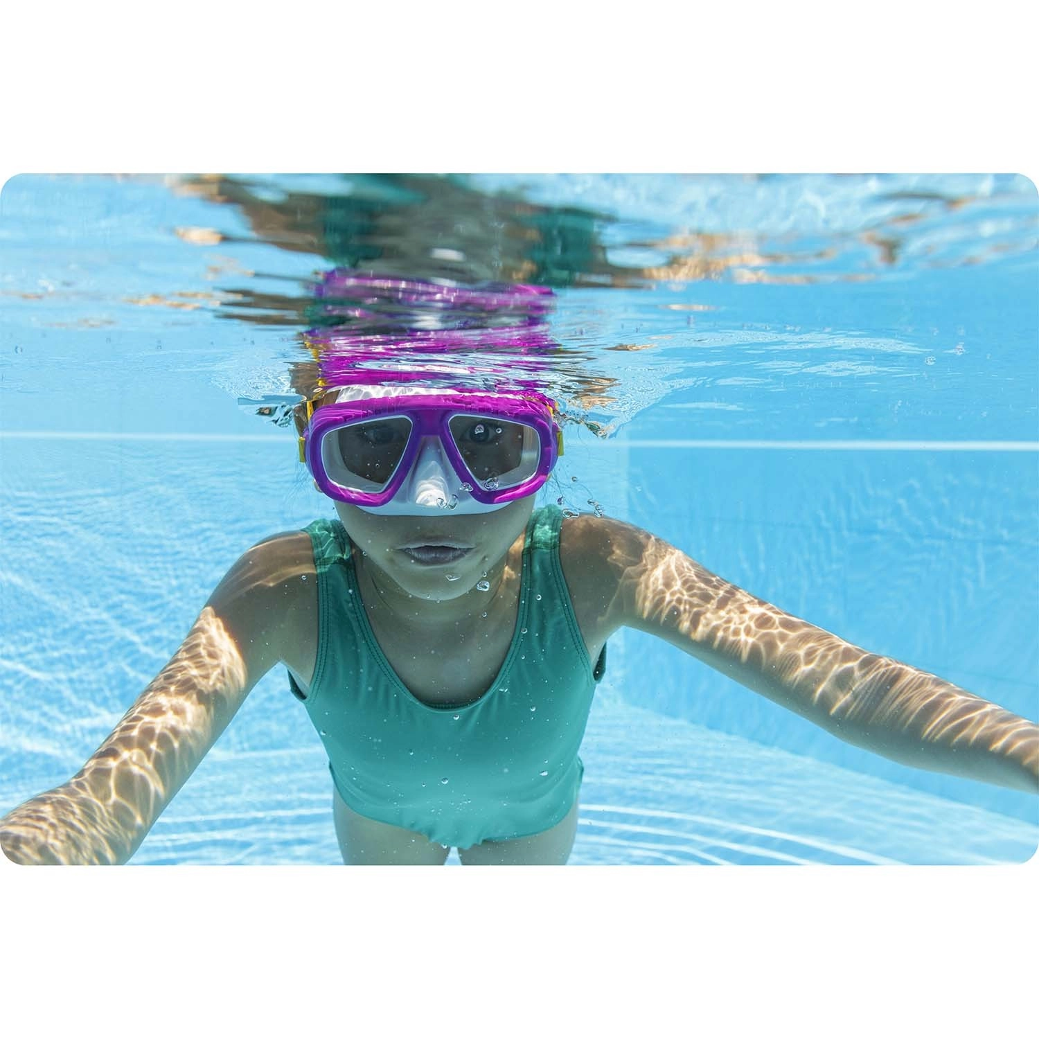 Dank des verstellbaren, doppelt geführten Silikonbands sitzt die Maske fest und bleibt auch bei Sprüngen und Spielen im Wasser an Ort und Stelle. Die leichte Konstruktion (nur 0,118 kg) ist auch bei längerem Tragen bequem und die latexfreien Materialien sind für empfindliche Haut geeignet.
