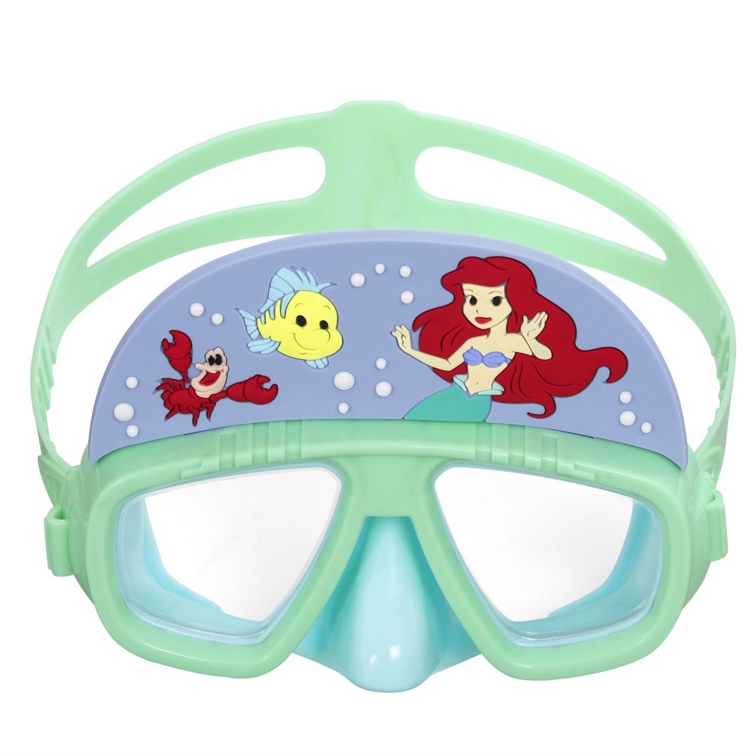 Diese niedliche Kindermaske mit Motiven von Arielle, Fabius und Sebastian ist für kleine Schwimmer entworfen, die die Wasserwelt sicher entdecken möchten. Schlagfeste Polycarbonatgläser sorgen für gute Sicht und schützen die Augen, während die weiche Dichtlippe angenehm am Gesicht anliegt und das Eindringen von Wasser minimiert.