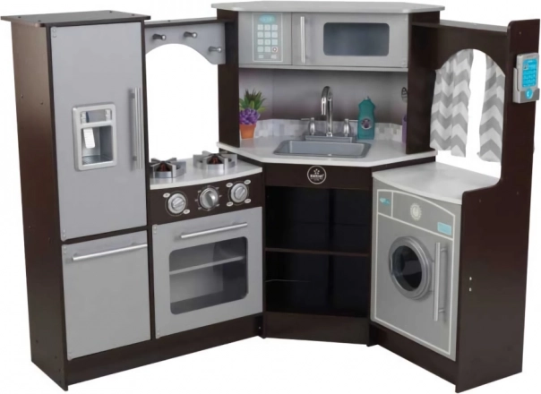 Die KidKraft Ultimate Corner Eckküche verwandelt das Kinderzimmer in einen echten Haushalt. Dank der durchdachten Eckanordnung wird der Raum optimal genutzt und Kindern wird alles geboten, was sie aus der Küche der Erwachsenen kennen – vom Spülbecken und Kochfeld bis hin zum Kühlschrank mit Eiswürfelspender und der Waschmaschine. Realistische Details wie das große Sichtfenster am Ofen, drehbare Knöpfe mit Klickgeräusch oder Haken für Utensilien unterstützen das fantasievolle Spiel.