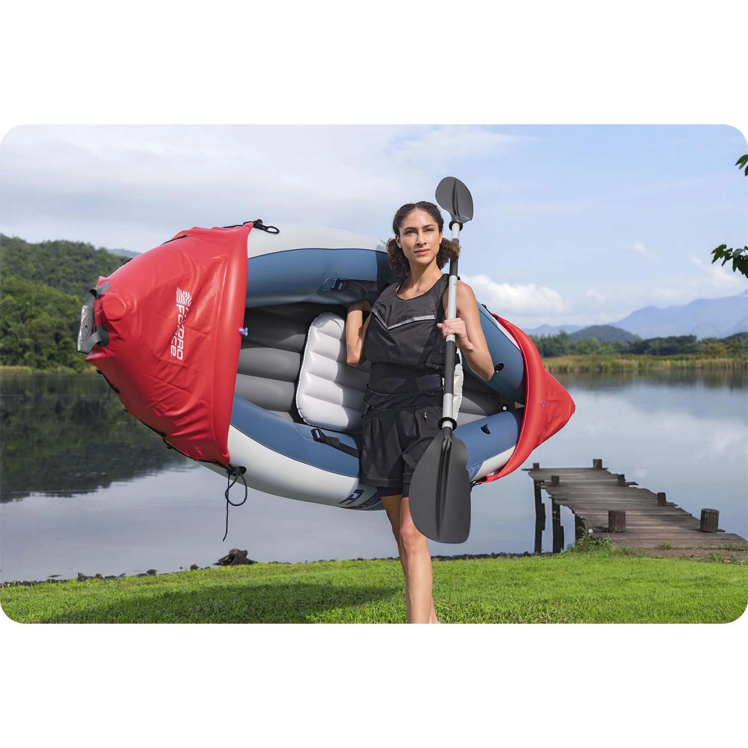 Das offene Cockpit ermöglicht einen leichten Ein- und Ausstieg, der verstellbare aufblasbare Sitz mit Rückenlehne erhöht den Komfort auch auf längeren Touren, und der feste aufblasbare Boden verbessert die Steifigkeit und Fahreigenschaften. Zwei abnehmbare Finnen (Skegs) unterstützen die Spurtreue und Wendigkeit, sodass sowohl Einsteiger als auch Fortgeschrittene auf ihre Kosten kommen.