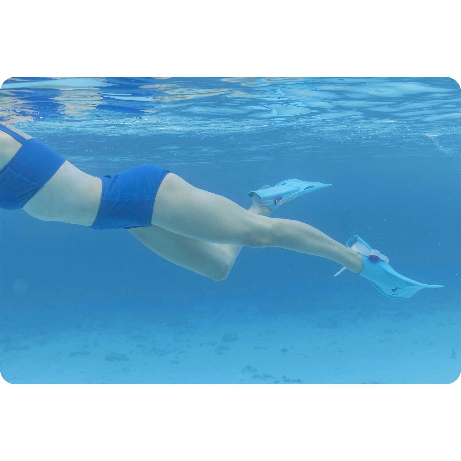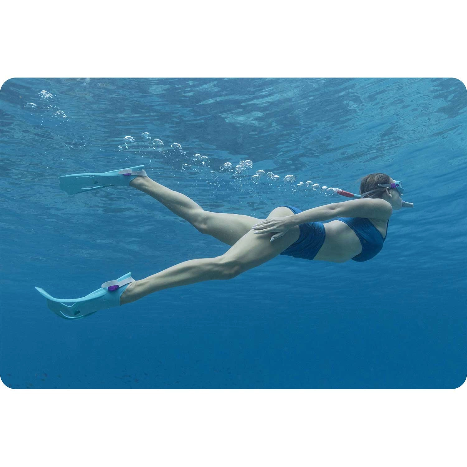 Der Schnorchel verfügt über ein Ausblas- (Purge-) Ventil für leichtes Entleeren von Wasser und einen Spritzschutz gegen Wellen für ruhigeres Einatmen an der Oberfläche. Die kurzen Flossen mit offener Ferse und verstellbarem Riemen sorgen für sicheren Vortrieb und angenehmen Tragekomfort beim Schwimmen; die kompakte Länge erleichtert zudem die Manövrierbarkeit und das Packen für Reisen.
