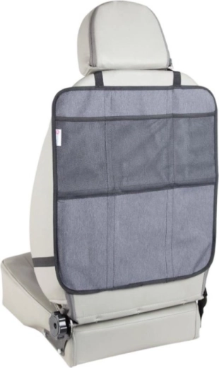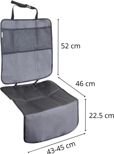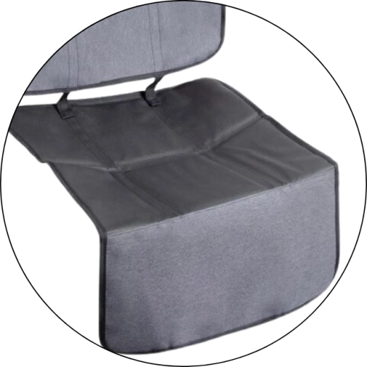 Das Produkt kann in zwei separate Teile geteilt werden – das Unterteil bedeckt die Sitzfläche und die Vorderkante unter dem Kindersitz, während das Oberteil als Trittschutz mit Aufbewahrungsfächern dient. Die Installation gelingt im Handumdrehen dank verstellbarer Gurte und der universellen Befestigung an der Kopfstütze.