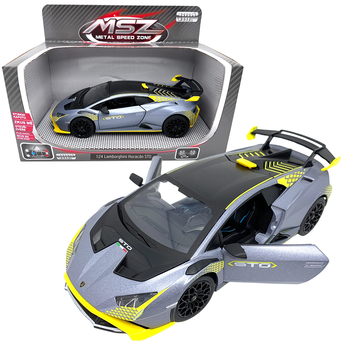 Entdecken Sie das realistische LAMBORGHINI Huracán STO Metallmodell im Maßstab 1:24, das Kinder wie Sammler begeistert. Es bietet öffnende Türen, Licht- und Soundeffekte sowie eine präzise Verarbeitung aus Metall mit Kunststoffdetails für lange Haltbarkeit und großartigen Spielspaß.