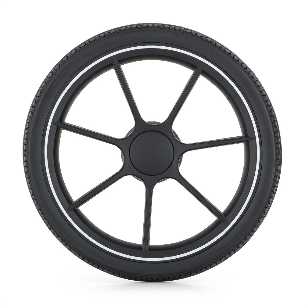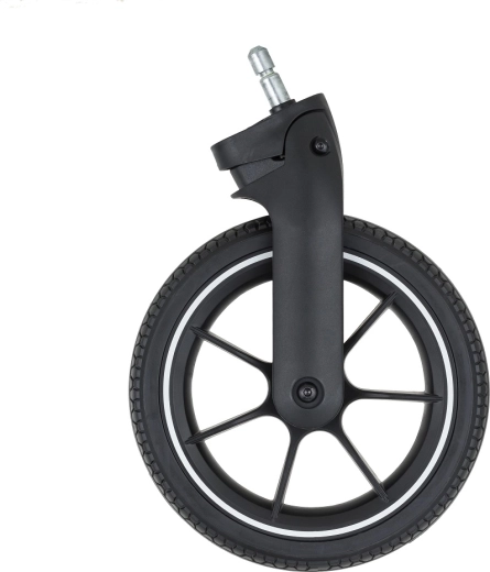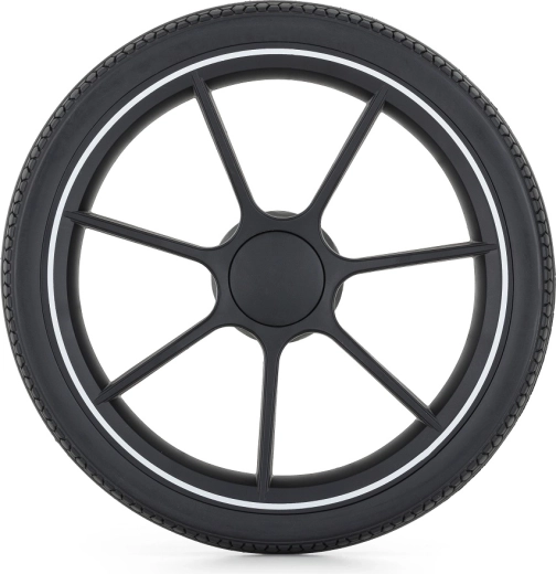 Große Gummiräder mit Federung und arretierbaren Vorderrädern meistern Stadt und Parkwege. Der stabile Rahmen sorgt für eine ruhige Fahrt und sicheres Handling.