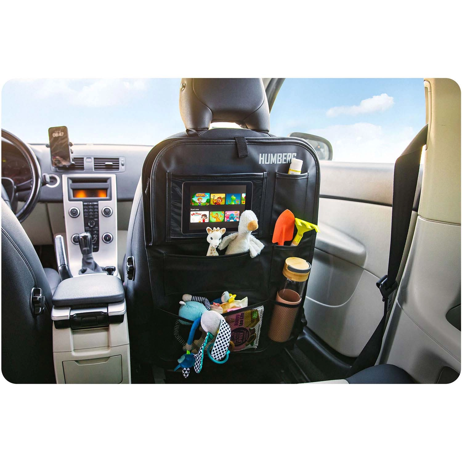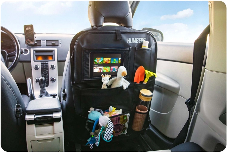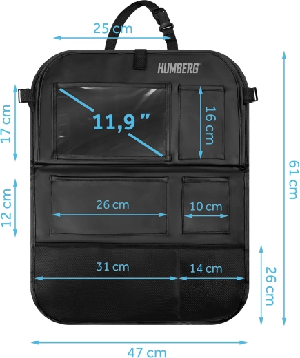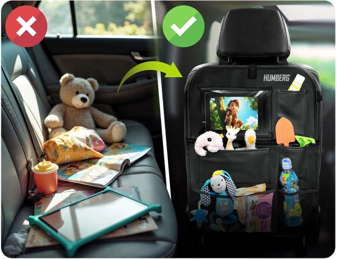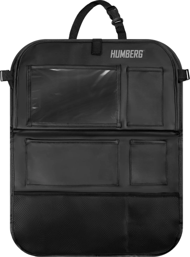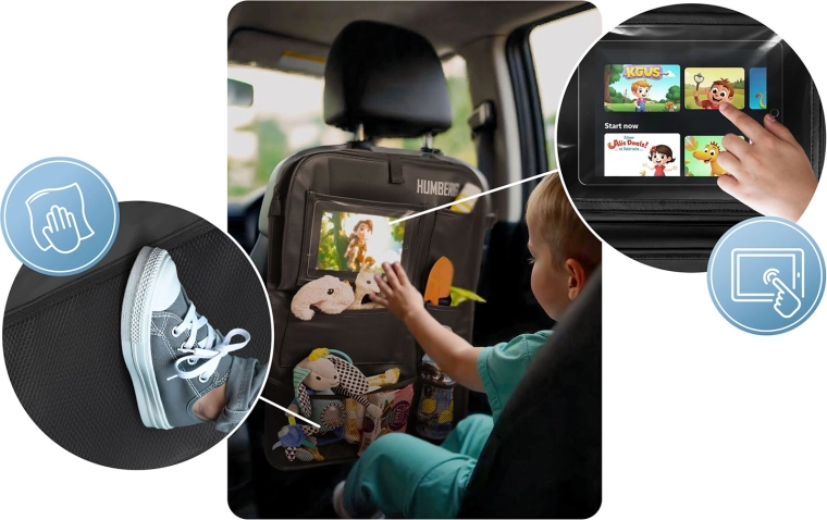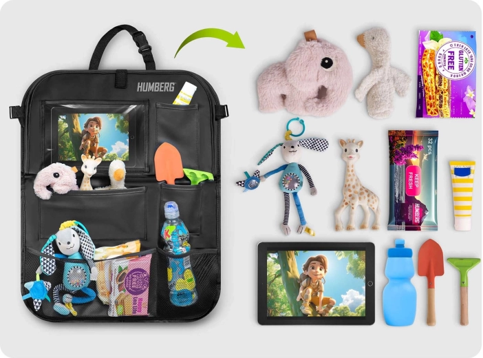 Verwandeln Sie Chaos auf der Rückbank in Ordnung. Der HUMBERG-Organizer bietet eine durchdachte Aufteilung des Stauraums: eine große transparente Tablet-Tasche (bis 11,9"), einen klappbaren Tisch für bequemes Schreiben und Snacken, elastische Getränkehalter sowie mehrere Fächer für Spielzeug, Bücher und Taschentücher. Die robuste Oberfläche aus PU-Kunstleder ist leicht zu reinigen und schützt die Rückenlehne vor Flecken und Tritten.