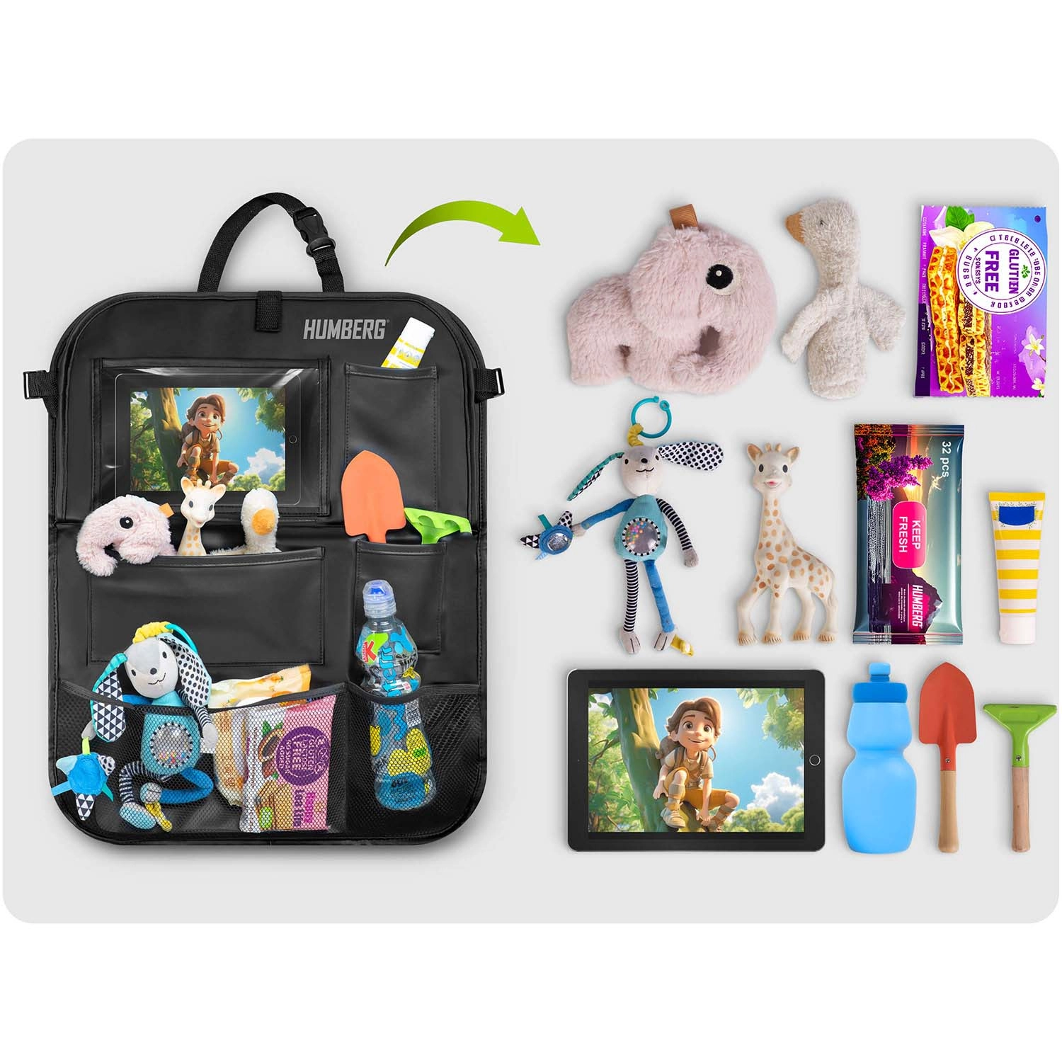 Die Montage gelingt im Handumdrehen dank verstellbarer Gurte. Kinder haben alles zur Hand – Tablet, Snacks, Flasche und Lieblingsspielzeug – und Sie fahren entspannt. Ideal für lange Fahrten und den Alltag.