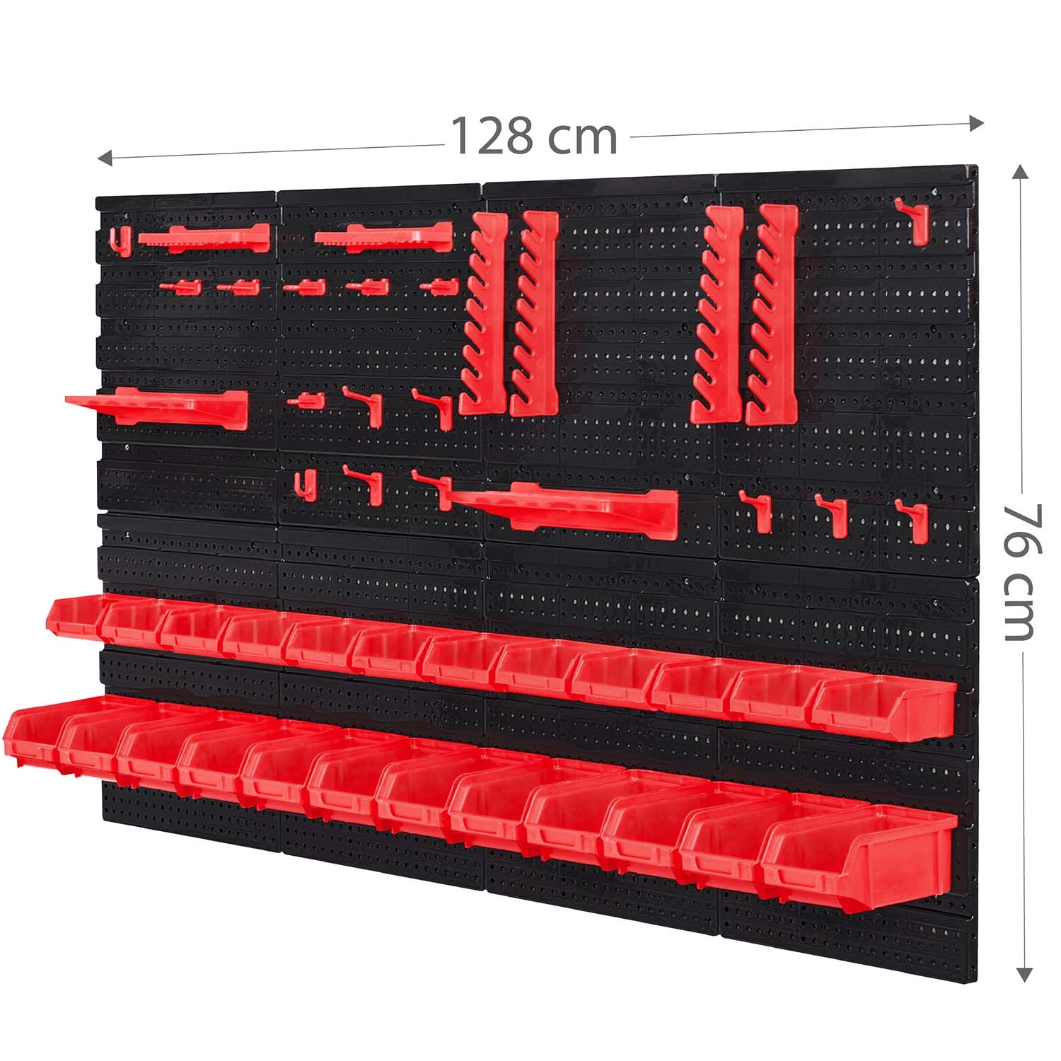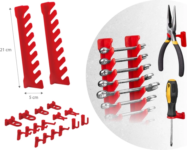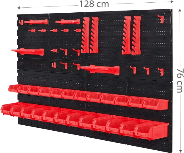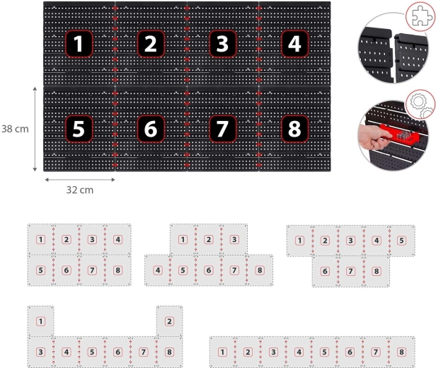 Lieferumfang: 6 modulare Paneele, 12 kleine Kuvetten (9,5 × 10 × 5 cm), 12 große Kuvetten (16 × 10 × 7,3 cm), 2 Ablagen 23 × 9 cm, 2 Ablagen 17 × 5 cm, 16 Halter und Haken, 2 Schlüsselhalter sowie Montagedübel für verschiedene Untergründe (Beton, Ziegel, Holz, Blech). Die Montage ist schnell und intuitiv – Elemente einfach in die Perforation einklicken und jederzeit umorganisieren.