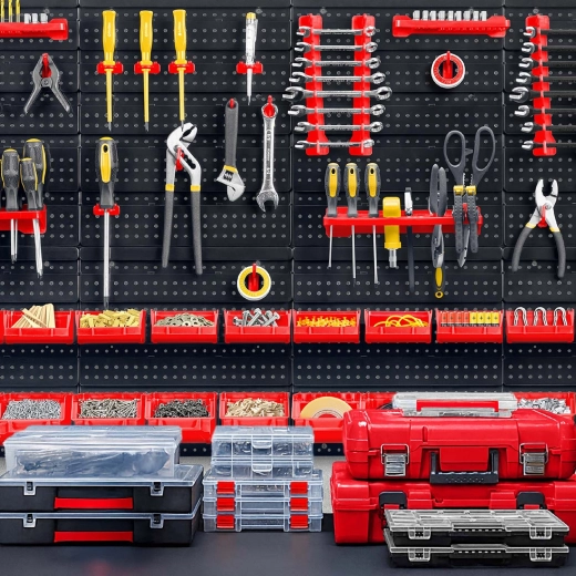 Sechs perforierte Paneele und 54 Zubehörteile ermöglichen die übersichtliche Aufbewahrung von Handwerkzeugen, Aufsätzen und Kleinteilen – stets griffbereit.