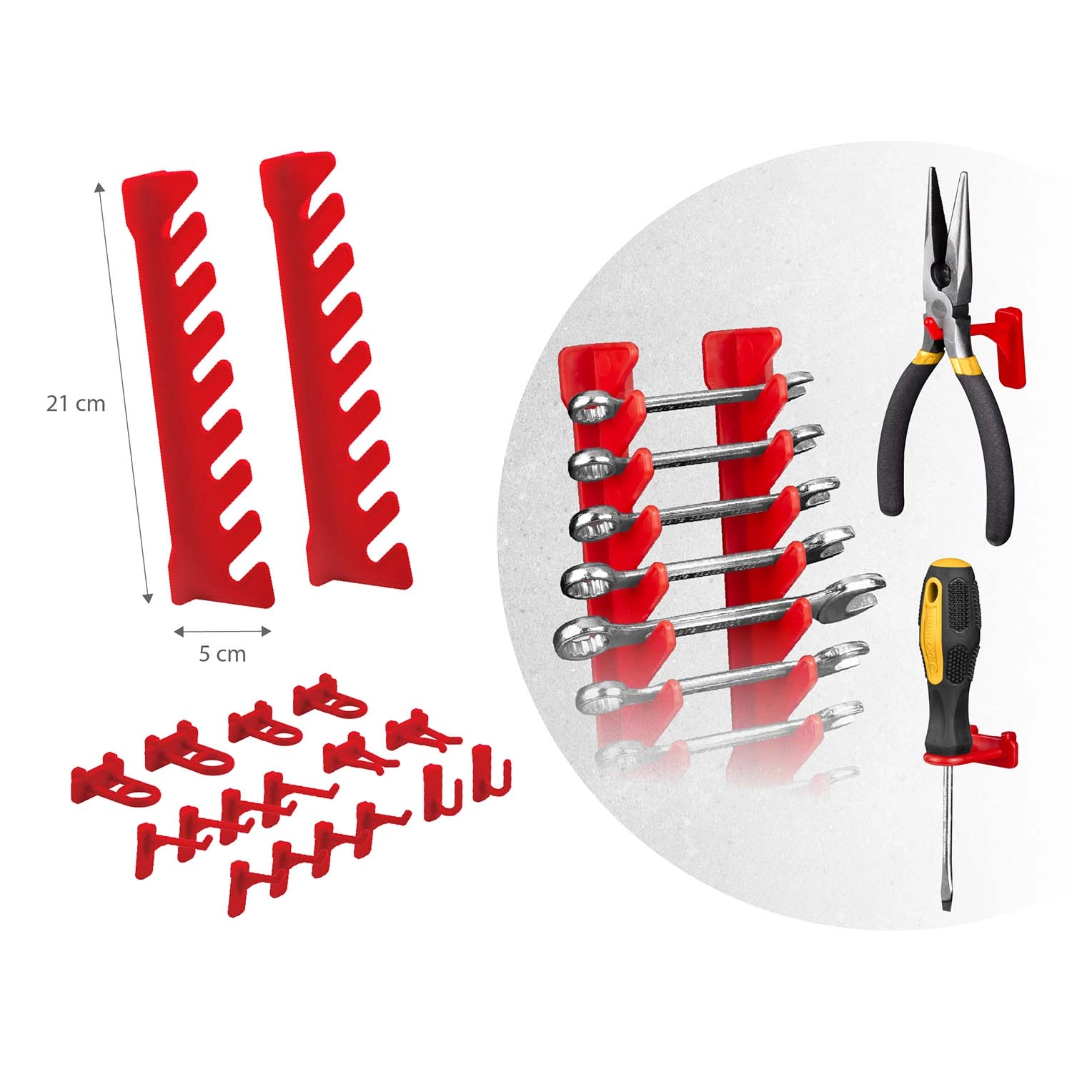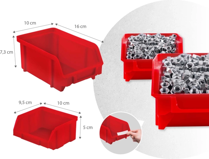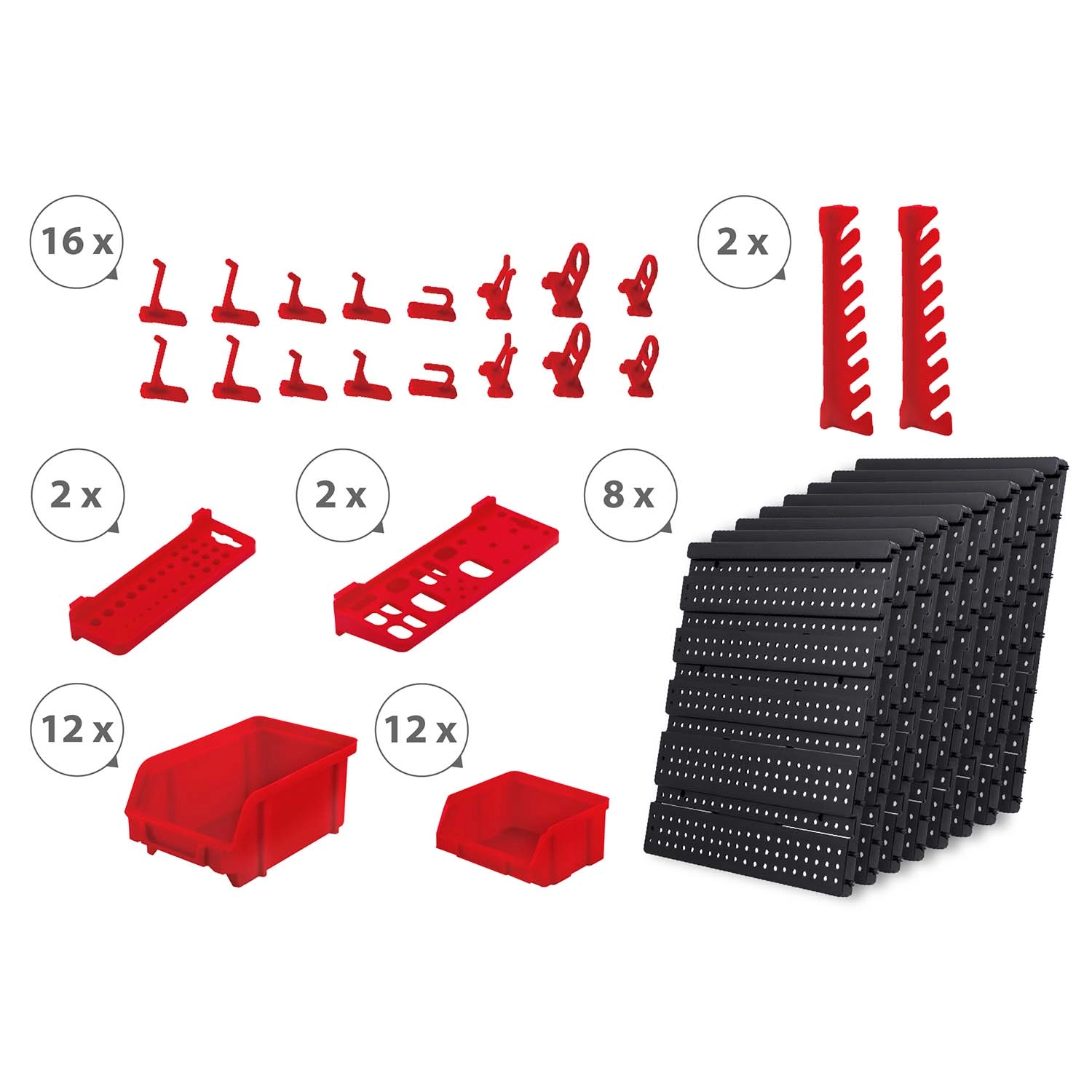 12 kleine und 12 große Kuvetten für Schrauben und Nägel, 16 Haken und Halter plus 2 Schlüsselhalter – einfaches Sortieren und schneller Zugang.