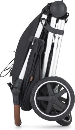 Schiebegriff und Bügel aus braunem Eco-Leder, großer Korb, Fußsack und Wickeltasche im Lieferumfang. Das nach innen gerichtete Einklappen mit einer Hand hält die Bezüge sauber.