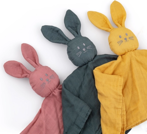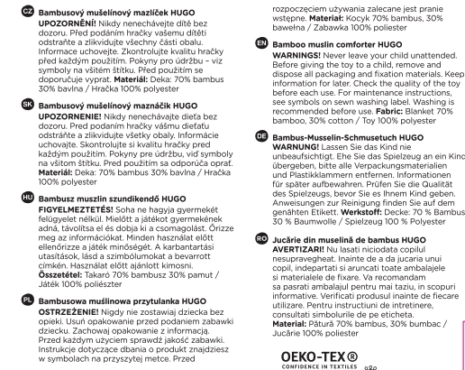 Bambus-Musselin ist von Natur aus hypoallergen, antibakteriell und geruchsresistent. Er besitzt thermoregulierende Eigenschaften – im Sommer angenehm kühl, im Winter wärmend. Im Köpfchen verbirgt sich eine sanfte Rassel, die das Baby beschäftigt, ohne zu stören. Das Material erfüllt den Oeko‑Tex Standard 100 und ist somit sicher für empfindliche Kinderhaut.