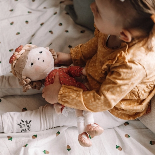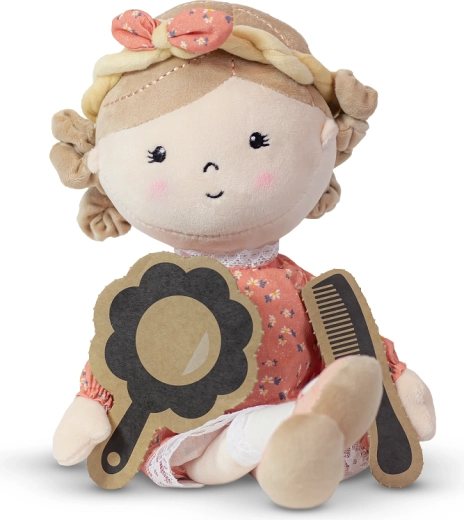 Puppe Sophie besticht durch angenehme Materialien – ein Körper aus weichem Polyester und ein Kleid aus 100 % Baumwolle. Dank ihres geringen Gewichts können sie selbst die kleinsten Händchen problemlos halten, und sie wird zur treuen Begleiterin zu Hause und auf Ausflügen. Ihr romantischer Look mit Blumen- und Spitzendetails wird Kinder auf den ersten Blick verzaubern.