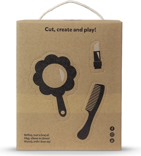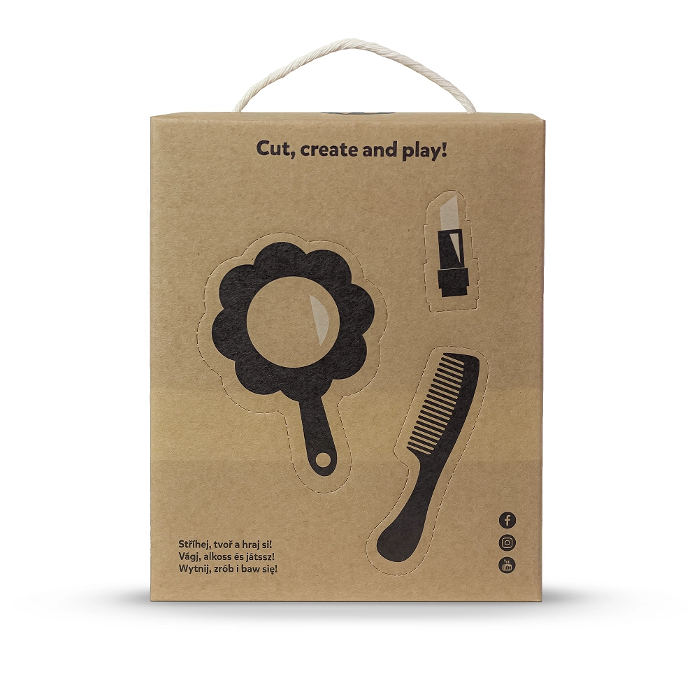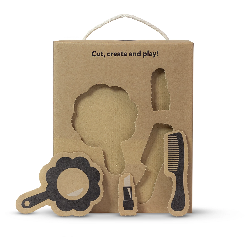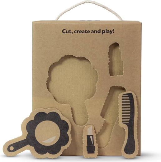 Die Verpackung mit dem Aufdruck „Cut, create and play!“ verbirgt kreative Karton-Accessoires – Spiegel, Kamm und mehr – für noch spielerischeres Vergnügen.
