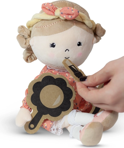 Die umweltfreundliche Verpackung dient auch zum Spielen: Auf der Rückseite der Box finden Sie Ausstanz-Accessoires (Kamm, Spiegel und mehr), die die Möglichkeiten des fantasievollen Spiels und der Puppenpflege erweitern. Sophie ist eine sichere Wahl für die Kleinsten, mit gestickten Gesichtszügen und weichen Teilen ohne harte Elemente.