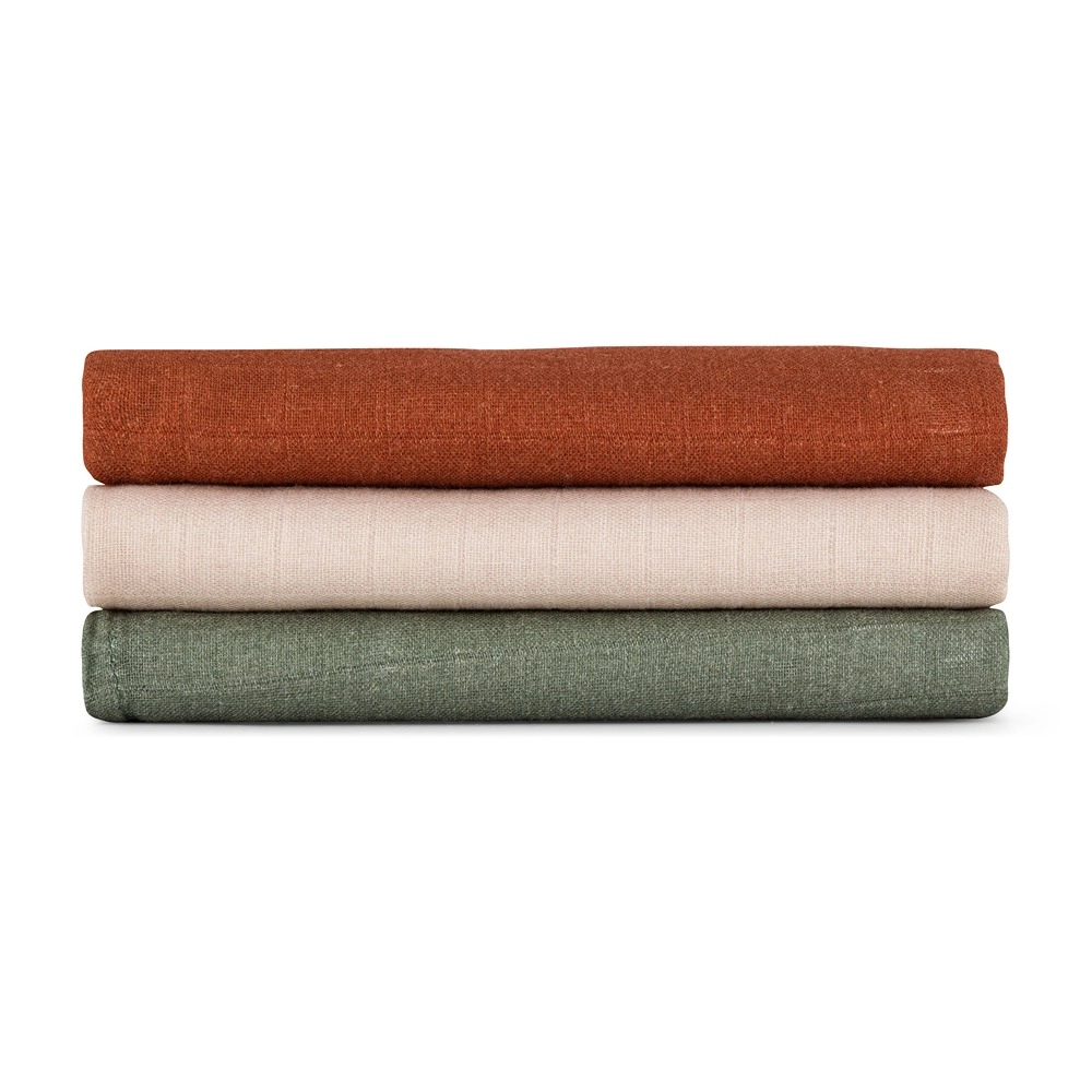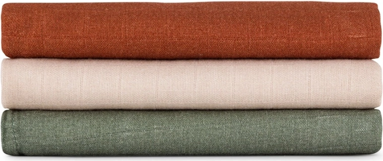 Ihre vielseitige Verwendung bewährt sich zu Hause wie unterwegs: als Windel, Waschlappen, Decke, Pucktuch oder Tuch fürs Bäuerchen. Musselin ist luftig, geruchsresistent und dank Thermoregulierung im Sommer angenehm kühl und im Winter wärmend. Die eleganten Earth Tones lassen sich leicht mit der Babyausstattung kombinieren.