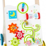 Der Gehwagen ist mit drehenden Zahnrädern, Eulen und einem bunten Labyrinth zur Förderung der Feinmotorik ausgestattet.