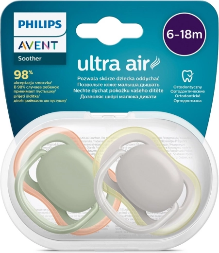 Der Philips Avent Ultra Air Schnuller wurde in Zusammenarbeit mit medizinischen Fachleuten und Müttern entwickelt, um maximalen Komfort und Sicherheit zu bieten. Extra große Öffnungen im Schild lassen die Haut frei atmen und reduzieren das Risiko von Reizungen. Der orthodontische, zusammendrückbare und symmetrische Sauger unterstützt die natürliche Entwicklung von Zähnen und Zahnfleisch und hilft, Ihr Kind schnell zu beruhigen.