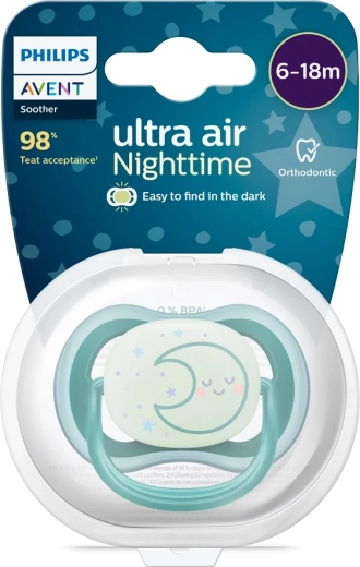 Der Philips Avent Ultra Air Nacht Schnuller wurde entwickelt, um Babys zu beruhigen und Eltern praktische Vorteile zu bieten. Dank der großen Luftöffnungen bleibt die Haut des Kindes trockener und weniger gereizt. Das leuchtende Mittelteil sorgt dafür, dass Sie den Schnuller auch mitten in der Nacht leicht finden.