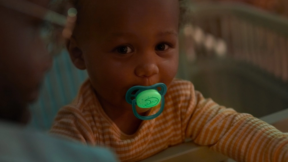 Das leuchtende Mittelteil des Schnullers ermöglicht nachts ein schnelles und leises Finden – ohne Licht anzuschalten und den Schlaf zu stören.