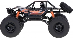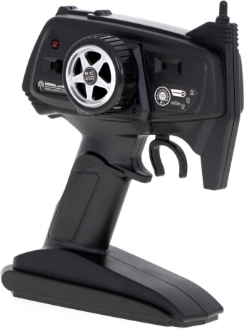 Enthalten ist ein 2,4‑GHz-Sender für eine stabile und störungsfreie Steuerung. Das Modell wird von einem Akku gespeist, die Fernsteuerung benötigt 4× AA 1,5 V. Die Abmessungen von 48 × 27 × 25 cm bieten ein ideales Verhältnis aus Wendigkeit und Geländegängigkeit.