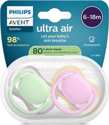 Philips Avent Ultra Air ist für maximalen Komfort und eine gesunde Entwicklung konzipiert. Große Lüftungsöffnungen halten die Babyhaut trockener und ruhiger, während weiches, orthodontisches Silikon ein natürliches Gefühl nachahmt und die richtige Zungen- und Bissposition unterstützt. Die Schnuller sind frei von BPA, BPS, Phthalaten und PVC und ihre Form sorgt für eine bequeme und sichere Anwendung.