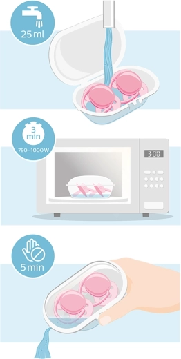 Praktisches Etui, das auch als Sterilisator dient – einfach Wasser hinzufügen und 3 Minuten in der Mikrowelle erhitzen.