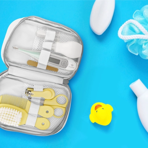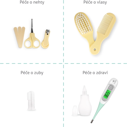 Schere und Nagelknipser mit abgerundeten Spitzen, Feilen, weiche Bürste, Kamm, Nasensauger und Fingerzahnbürste – stets griffbereit und sicher verstaut.