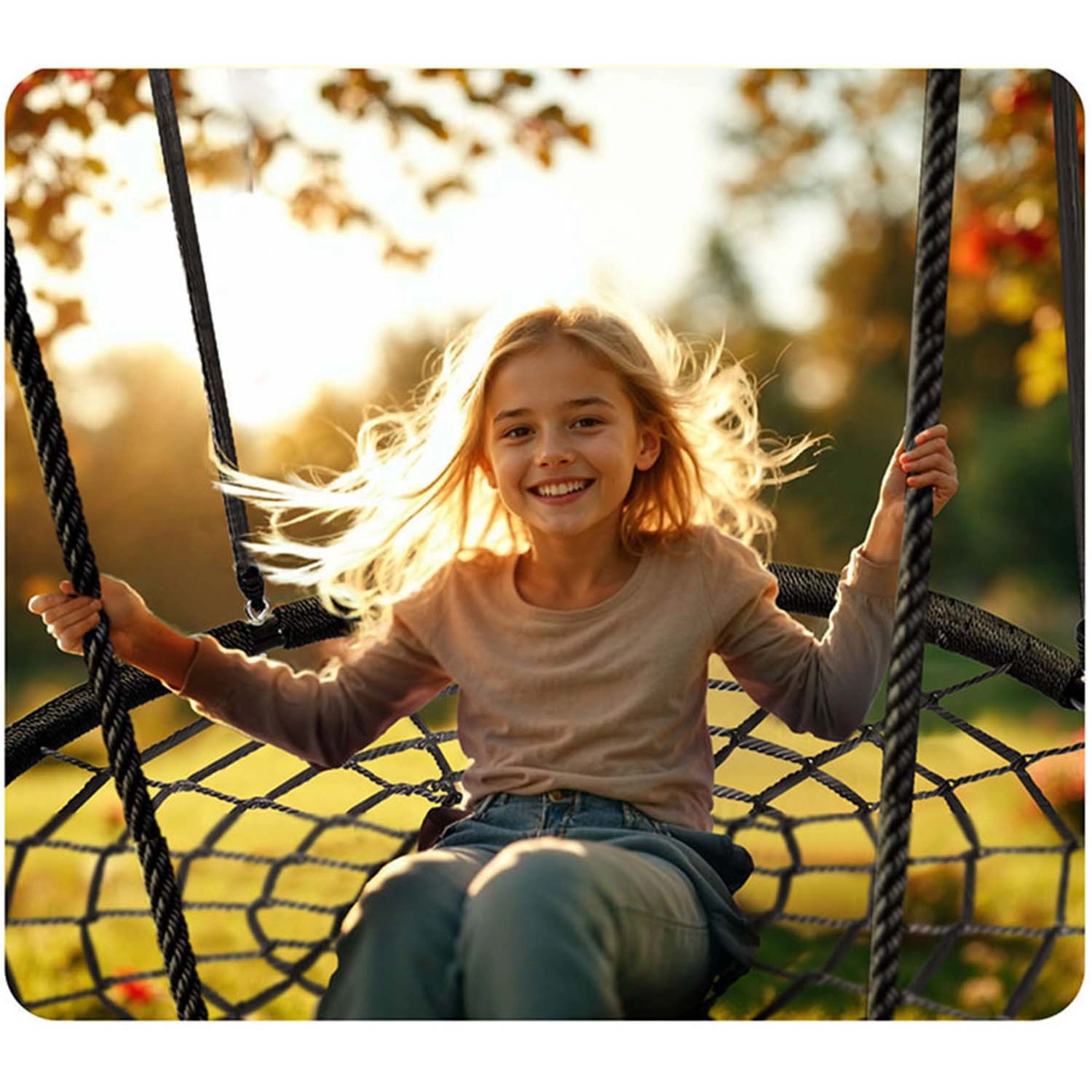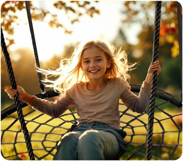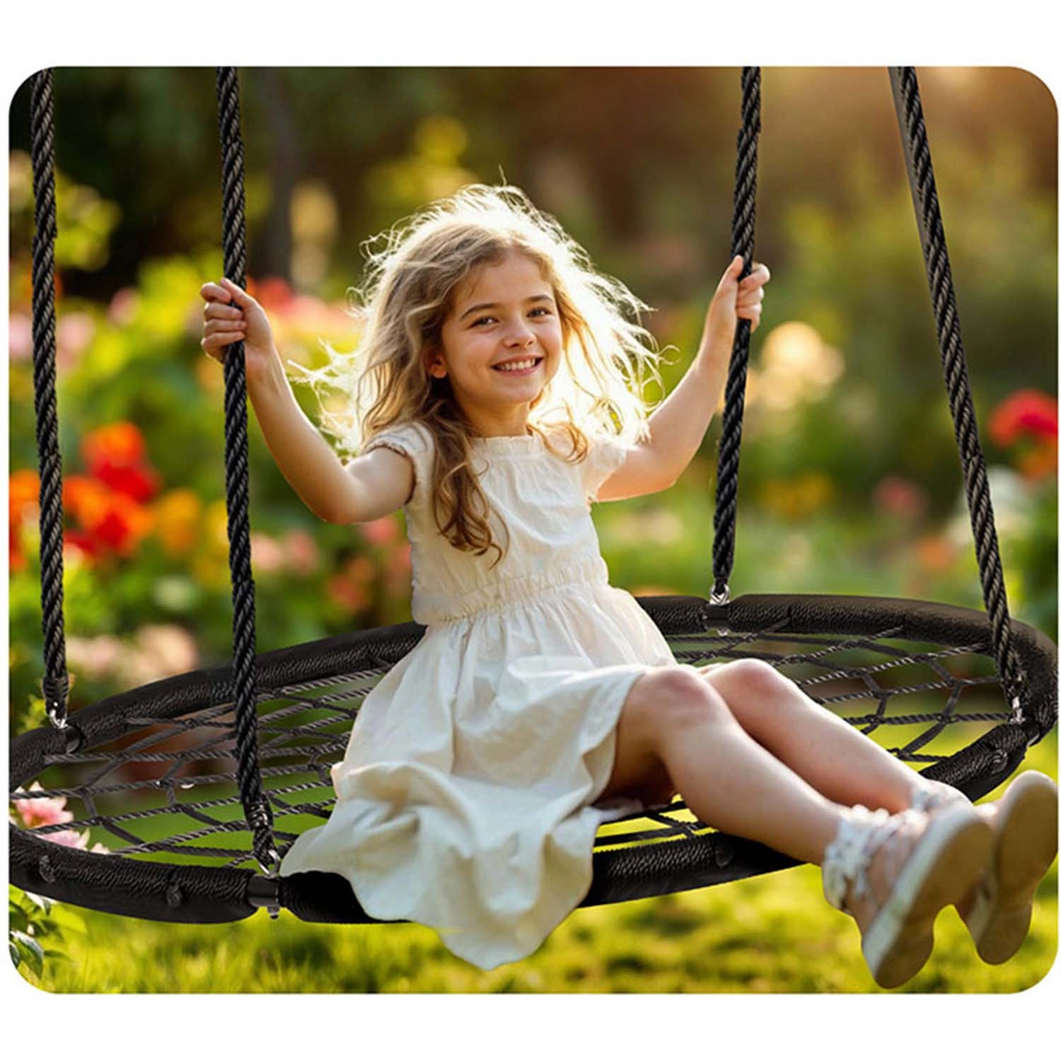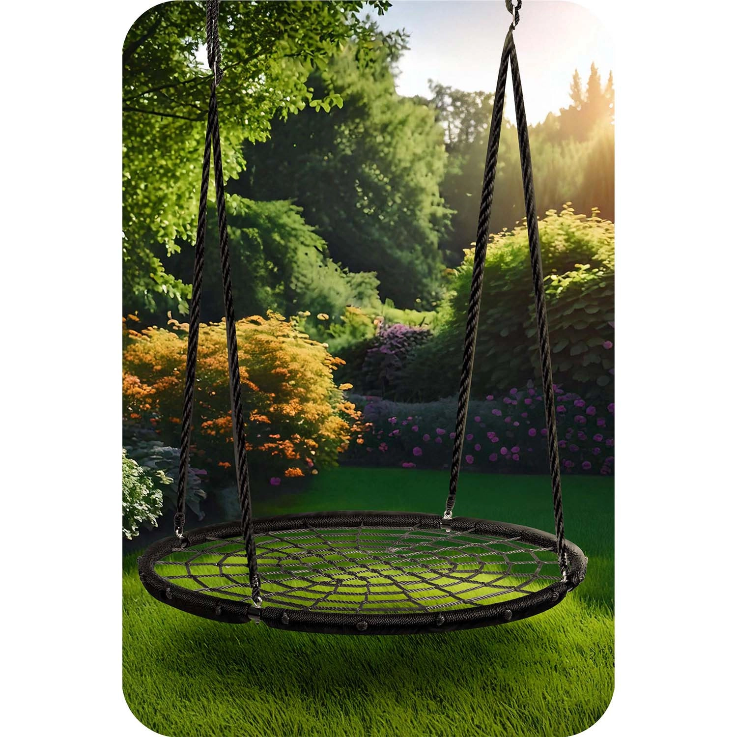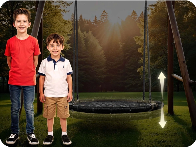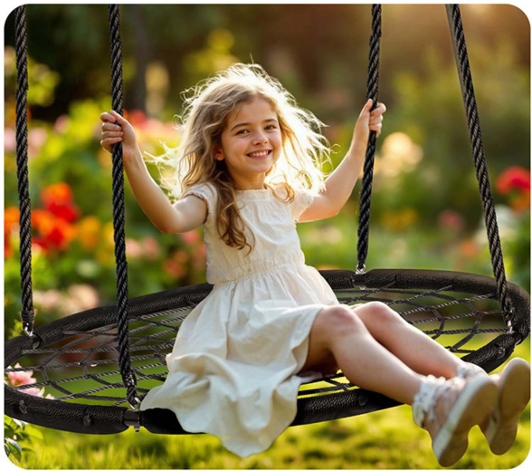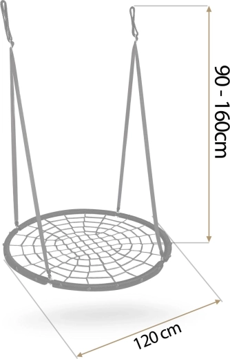 Die in der Höhe verstellbaren Aufhängeseile (ca. 90–160 cm) ermöglichen die Anpassung der Schaukel an Alter und Größe des Kindes. Die großzügige Sitzfläche mit einem Durchmesser von 120 cm bietet bequem Platz für mehrere Kinder gleichzeitig, und die Tragfähigkeit bis 150 kg sorgt für sicheres Schaukeln auch für Erwachsene. Ideal für Garten, Hof oder Pergola.