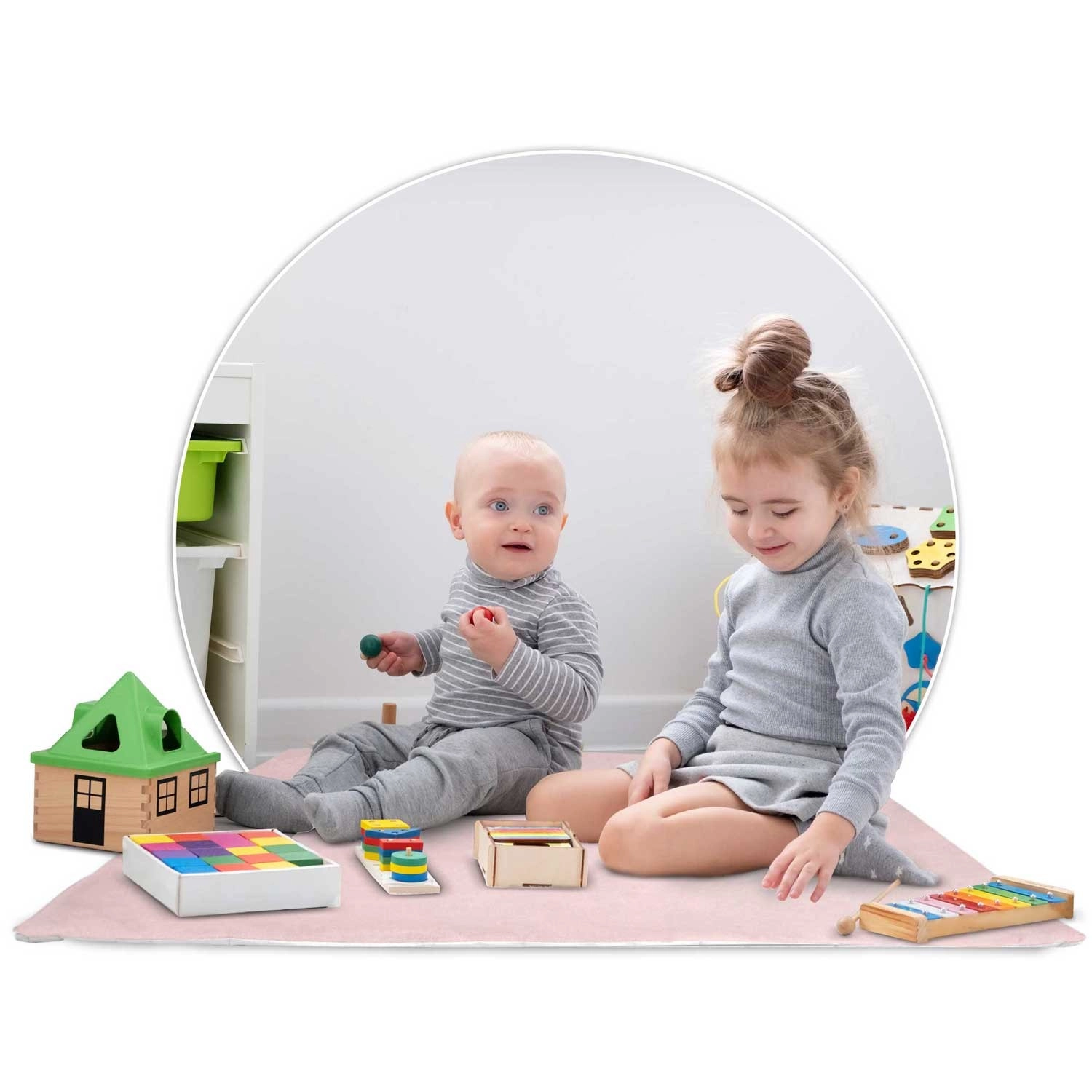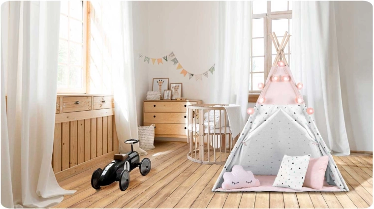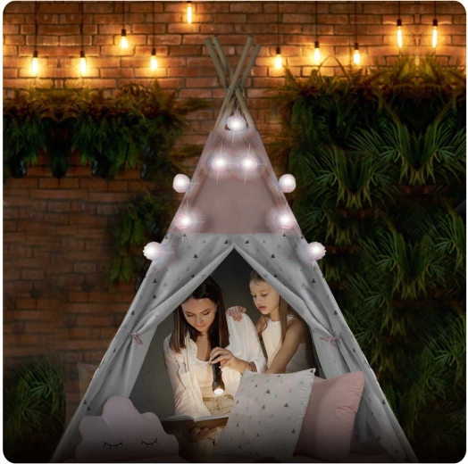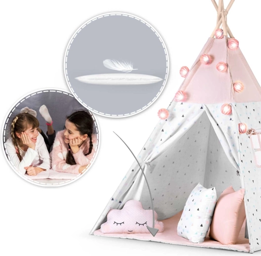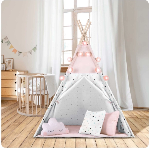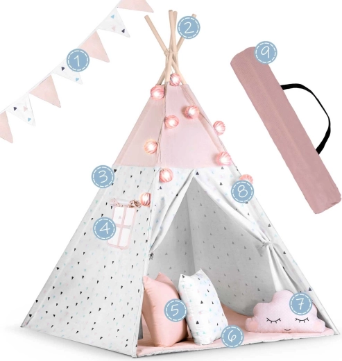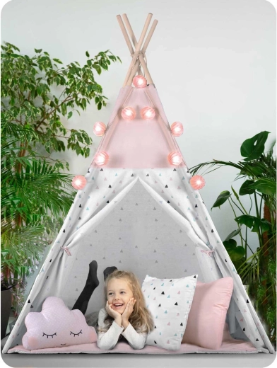 Im Lieferumfang enthalten sind 3 dekorative Kissen, eine weiche isolierende Unterlage mit Rutschschutz, eine Girlande, eine Lichterkette und eine Tasche. Alles, was Sie brauchen, um im Handumdrehen eine zauberhafte Spielecke zu schaffen.
