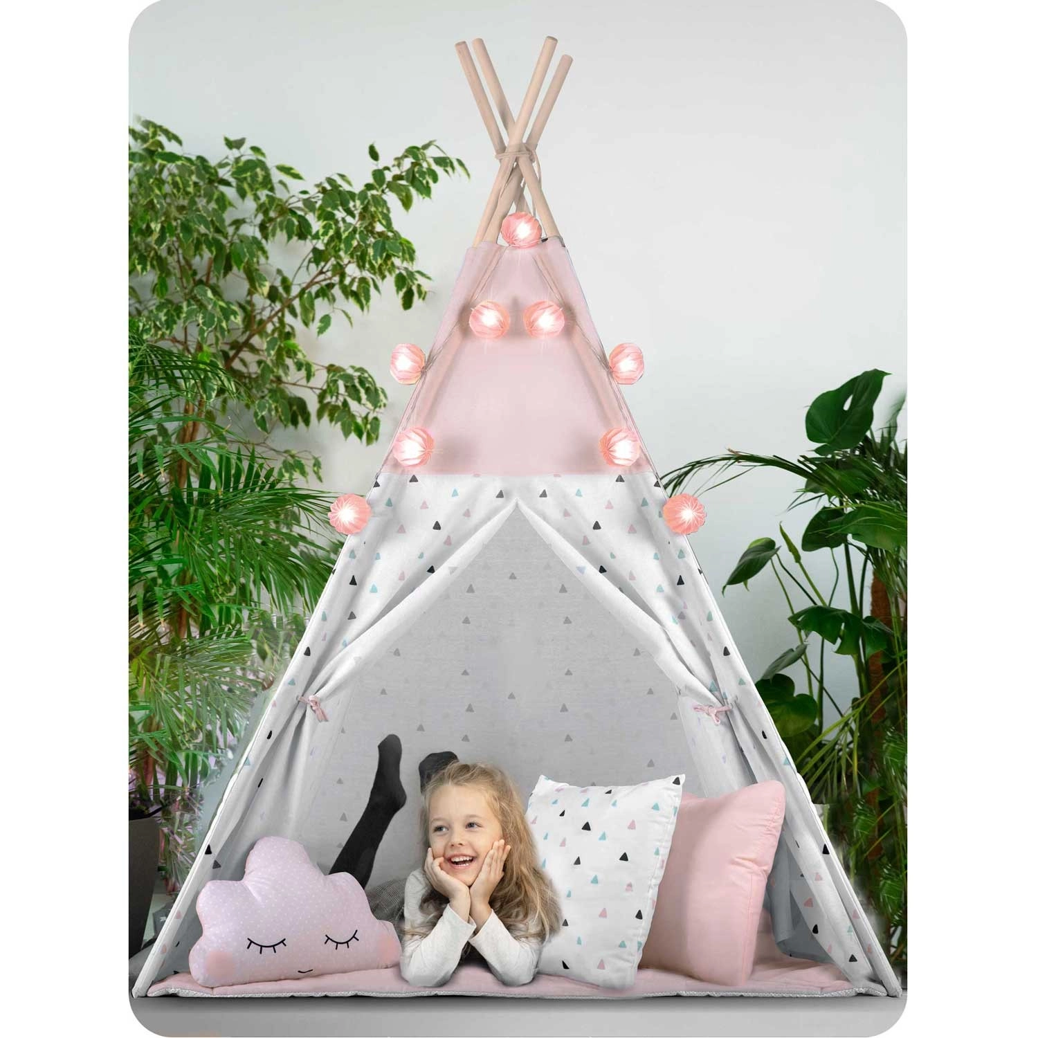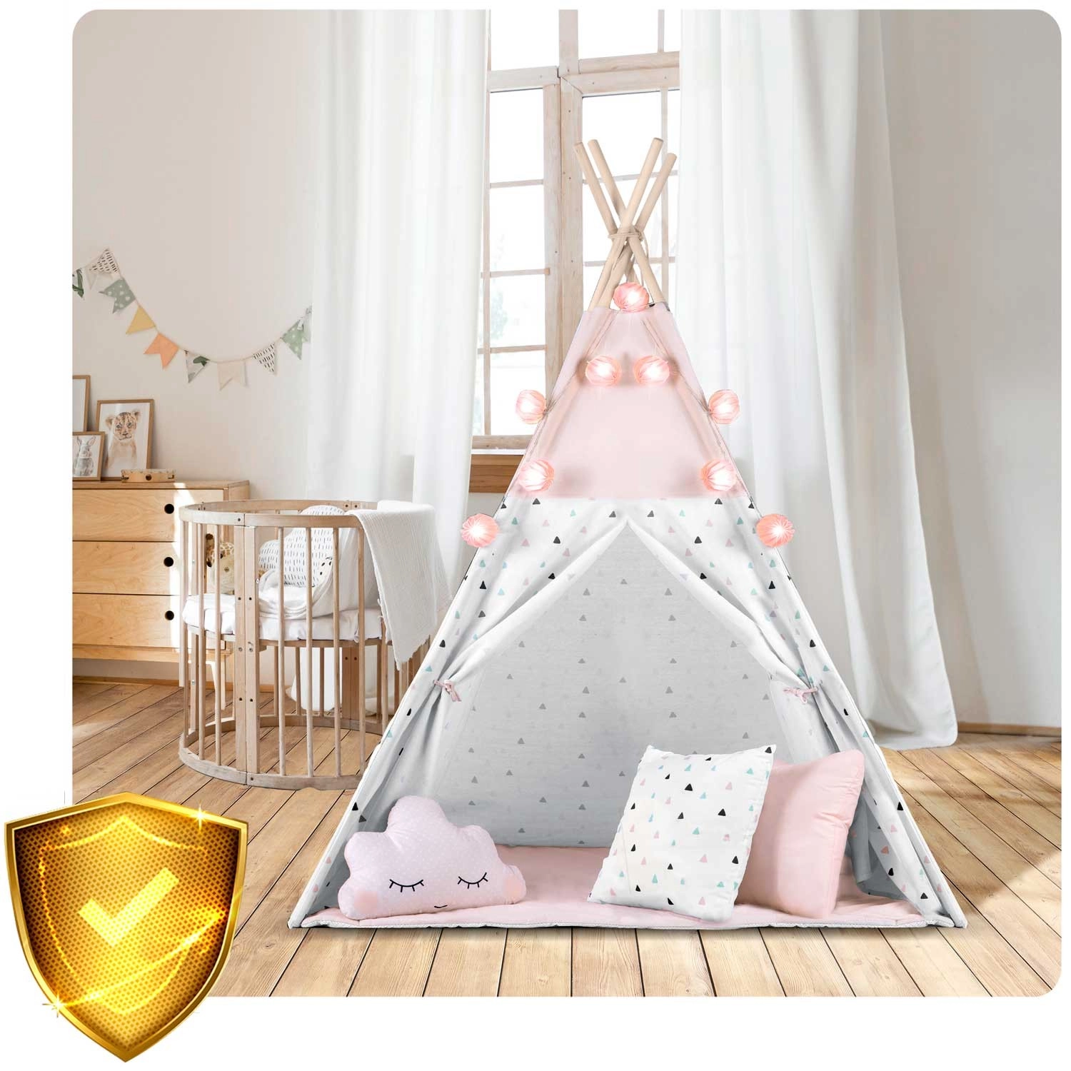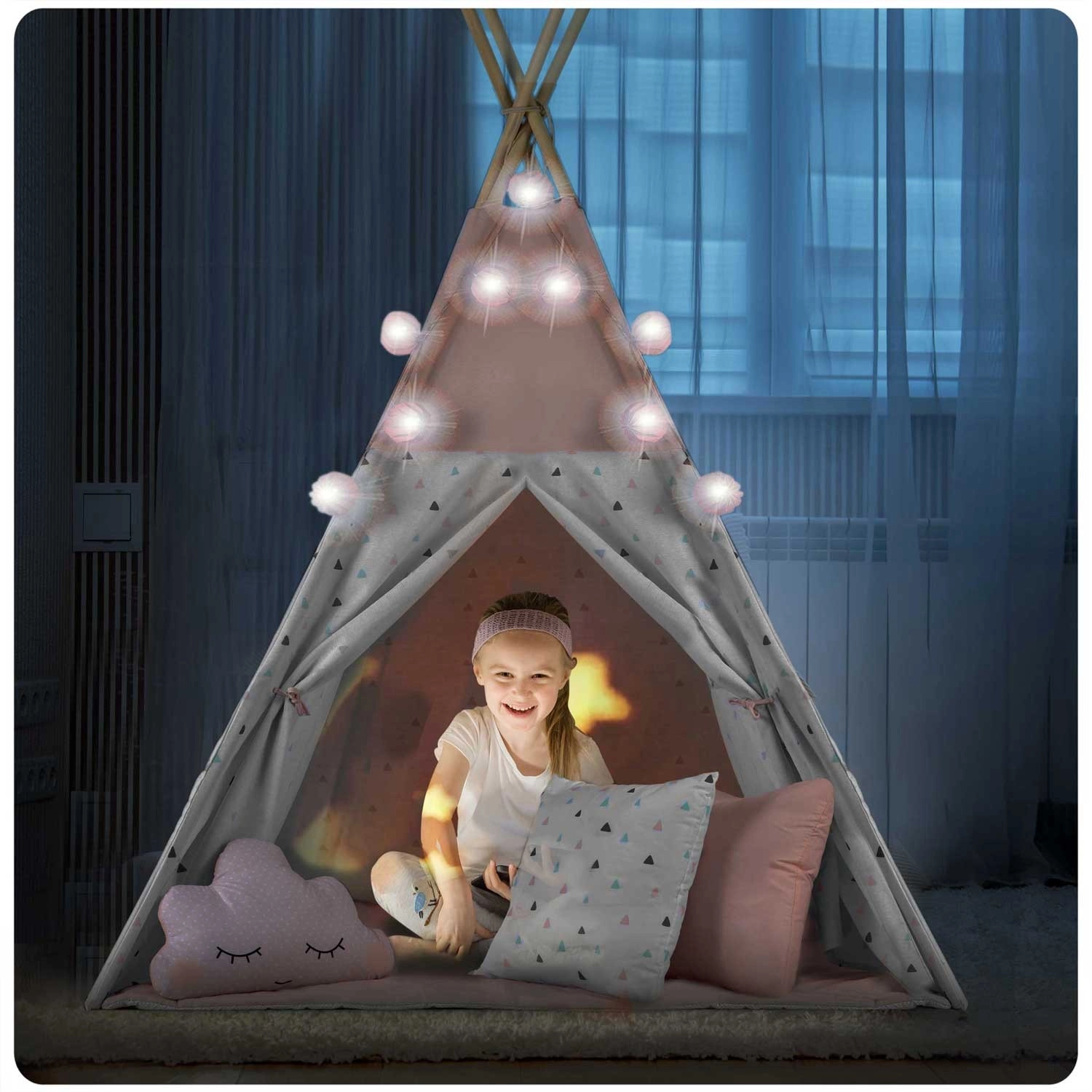 Zum Set gehört eine isolierende Unterlage mit rutschhemmenden Noppen, die vor Bodenkälte schützt und den Komfort beim Spielen und Lesen erhöht. Drei kuschelweiche Kissen sowie dekorative Lichterkette mit Girlande sorgen für eine gemütliche Atmosphäre. Das zu öffnende Fenster mit Rollo und der aufrollbare Eingang unterstützen fantasievolles Spiel und passen natürlich zu den Prinzipien der Montessori-Pädagogik.