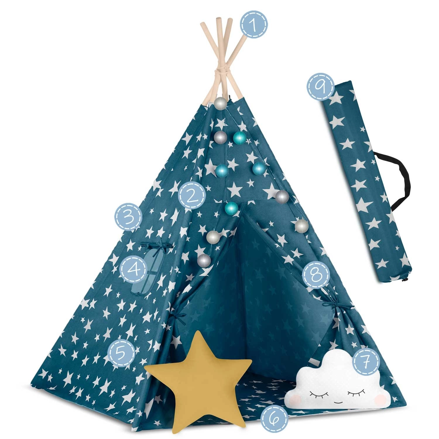 Schenken Sie Kindern ihre eigene „Basis“ zum Spielen, Lesen und Ausruhen. Das Nukido-Tipi in zartem Blau mit Sternen vereint natürliche Materialien, ein ästhetisches Design und funktionale Details – vom zu öffnenden Fenster bis zu fixierbaren Eingängen. Der eingenähte Boden bleibt an Ort und Stelle und sorgt zusammen mit den zwei weichen Kissen für maximalen Komfort.
