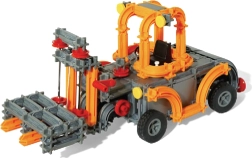 Bauen Sie den beliebten Gabelstapler. Die Gabeln heben problemlos eine „Palette“, der Ausleger ist drehbar und mit einer Kurbel samt Schnur (nicht im Lieferumfang enthalten) lässt sich das Senken und Heben der Last simulieren.