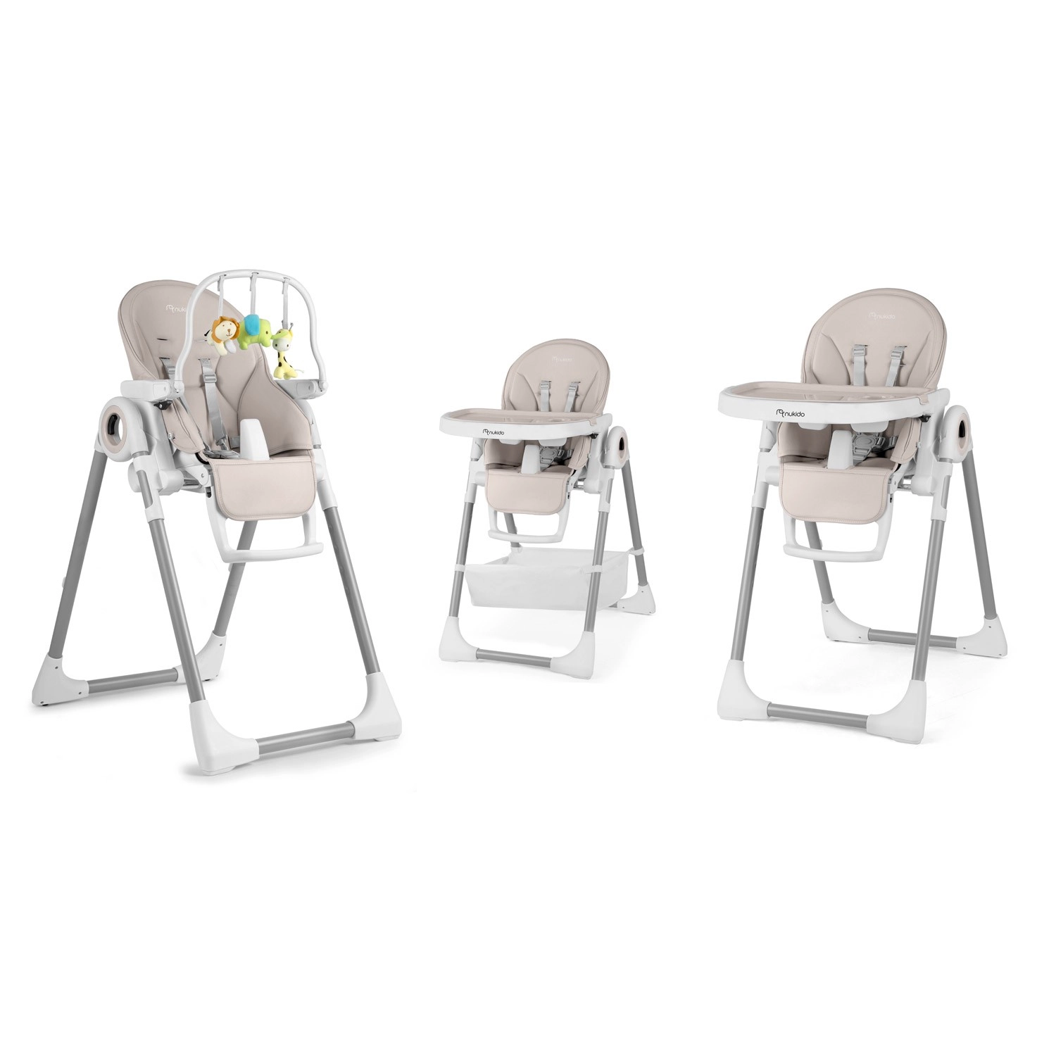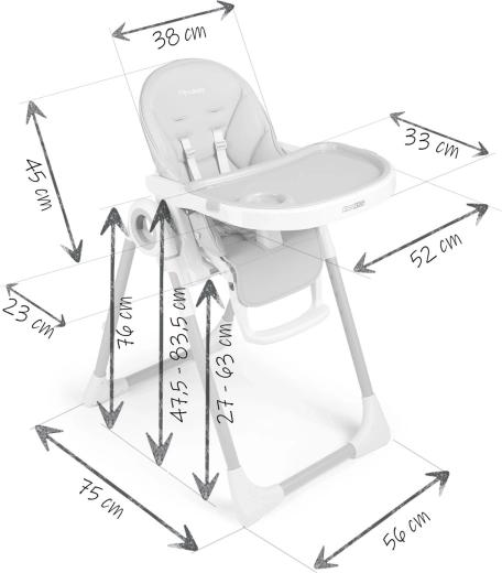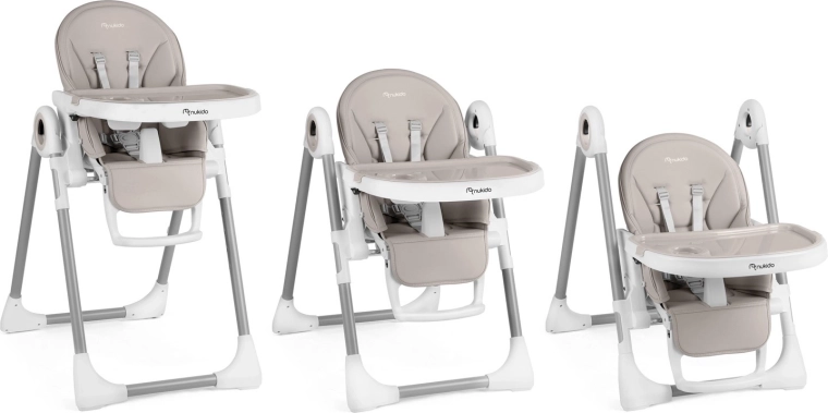 Nukido Belo bietet Komfort und Sicherheit beim täglichen Füttern und Spielen. Dank der 8-stufigen Höhenverstellung passt sich der Stuhl leicht an Esstisch oder Sofa an. Die 5-fache Verstellung der Rückenlehne und die verstellbare Fußstütze machen aus dem Stuhl eine bequeme Liege für die Kleinsten und einen komfortablen Sitz für Kleinkinder.