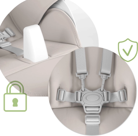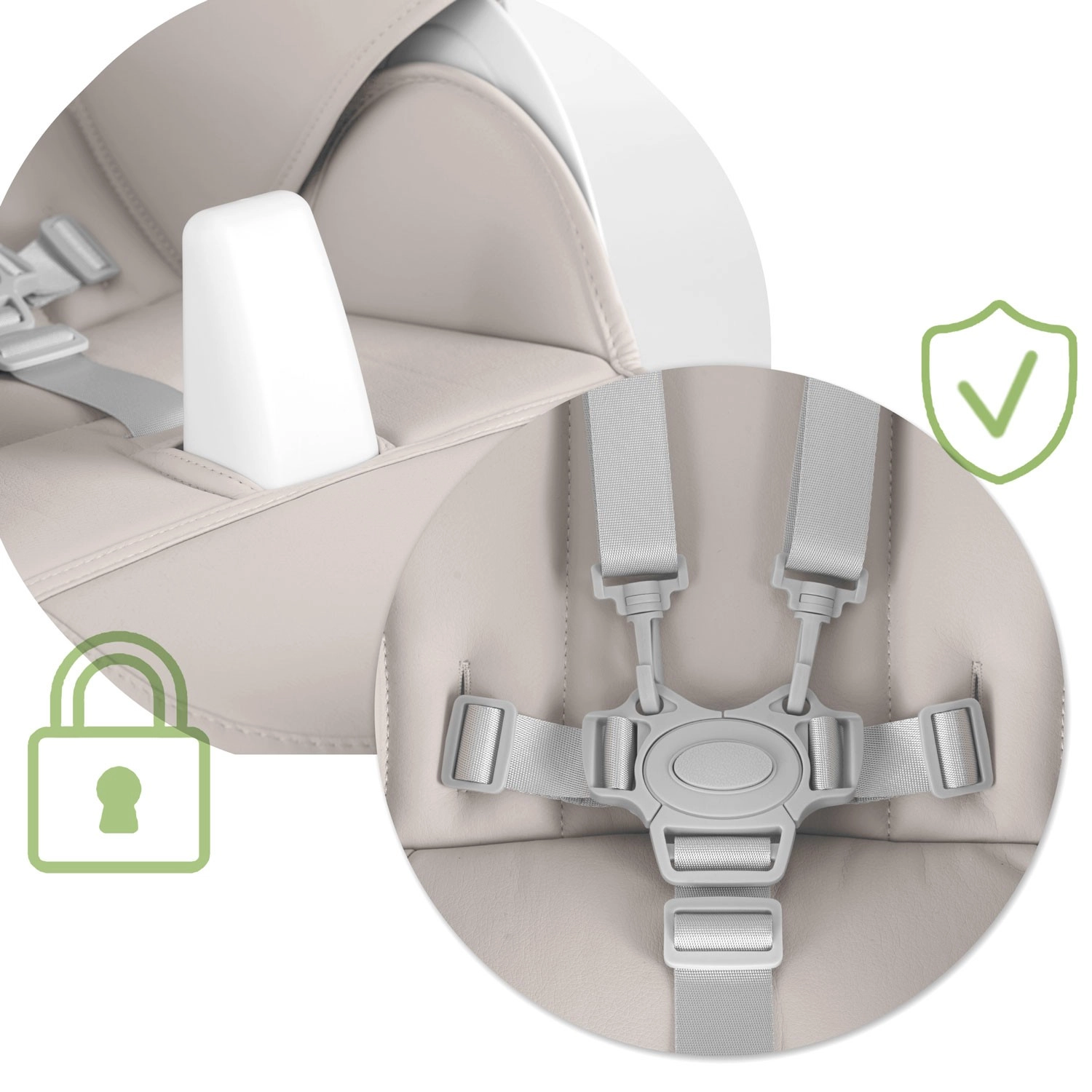 Bequeme Polsterung, 5-Punkt-Sicherheitsgurte und ein Mittelsteg verhindern das Abrutschen des Kindes. Eine breite Basis sorgt für Stabilität beim Füttern und Spielen.