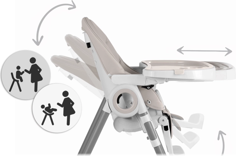 Die 8-stufige Höhenverstellung, 5 Positionen der Rückenlehne und eine verstellbare Fußstütze ermöglichen die Nutzung des Stuhls von den ersten Monaten als Liege bis hin zum eigenständigen Essen.