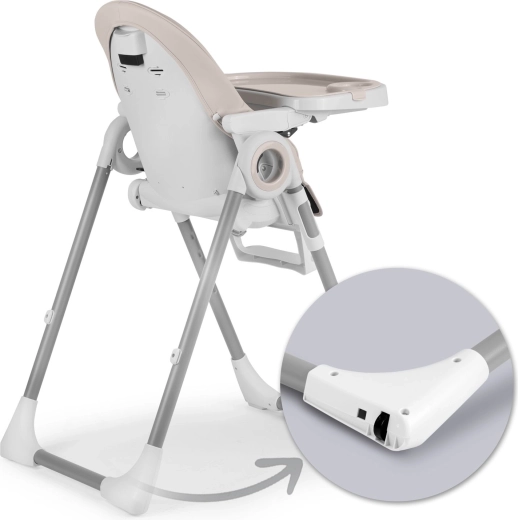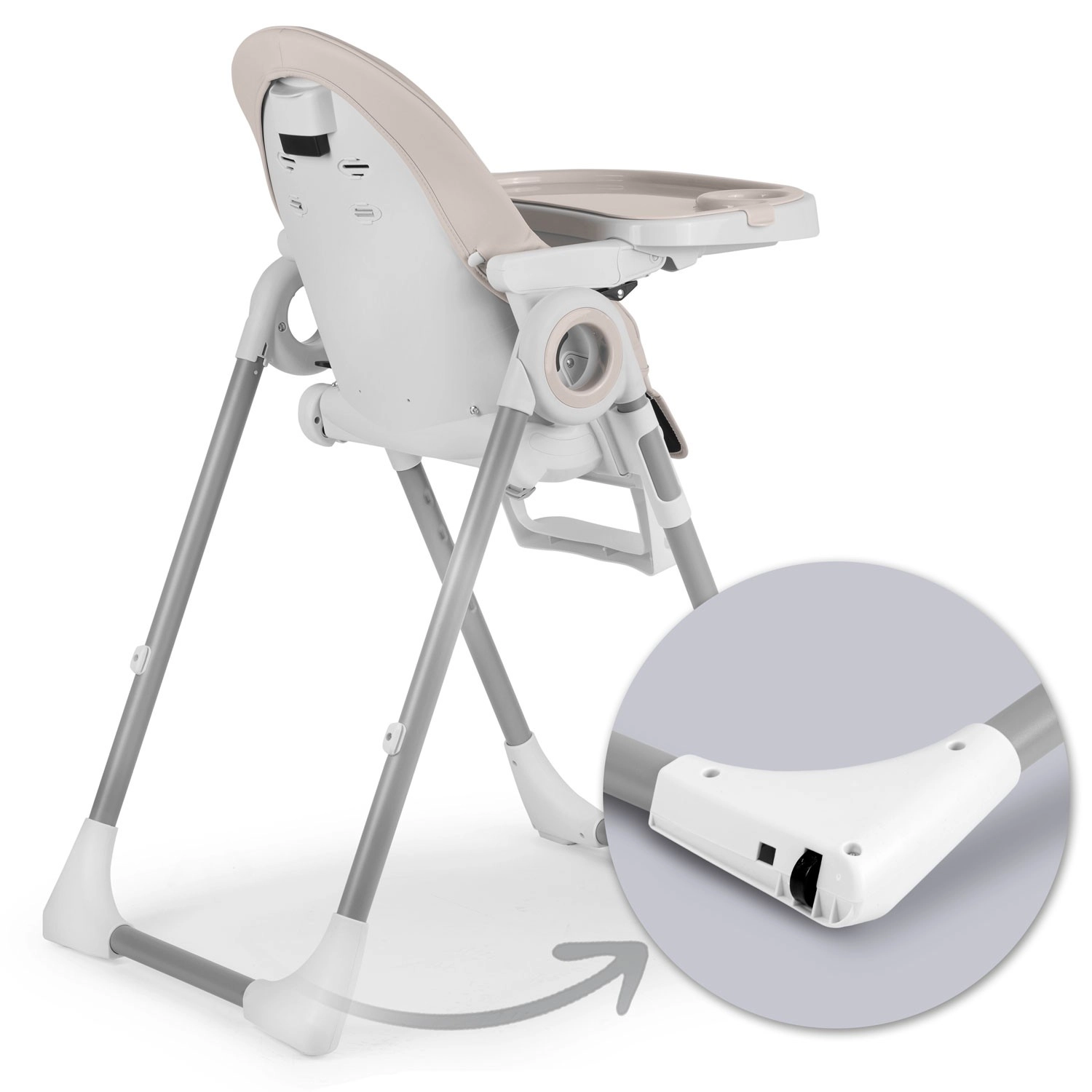 Das abnehmbare Tablett mit erhöhten Rändern und zusätzlicher Einlage erleichtert die Reinigung nach dem Essen – die Einlage kann abgenommen und unter fließendem Wasser abgespült werden. Die Bezüge sind schmutzabweisend und lassen sich einfach abwischen. Hintere Rollen erleichtern das schnelle Umstellen des Stuhls, während die breite Basis und 5-Punkt-Gurte Stabilität und Sicherheit gewährleisten.