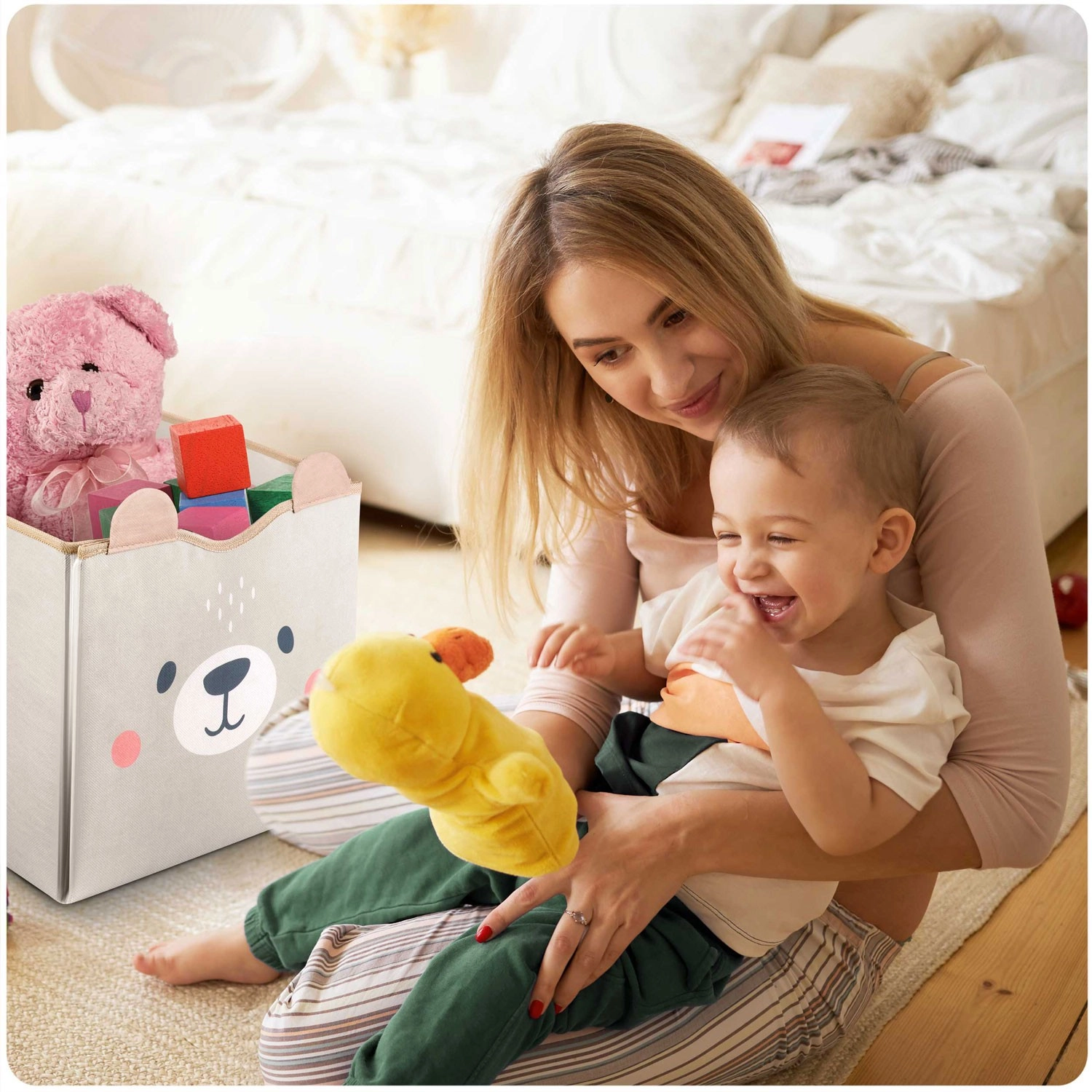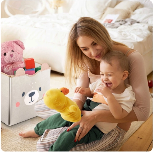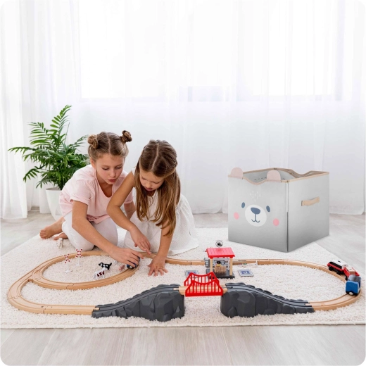 Entdecken Sie die clevere Kombination aus Aufbewahrung und Spiel. Der 2-in-1-Spielzeugkorb mit Spielmatte ist darauf ausgelegt, Platz, Zeit und Nerven zu sparen. Als Korb bietet er ein außergewöhnlich großes Volumen und Stabilität, ausgeklappt verwandelt er sich in eine weiche Spielunterlage mit Straßen für Autos und Figuren. Das minimalistische graue Design mit Bär passt perfekt in moderne Interieurs und dient als dekoratives Element.